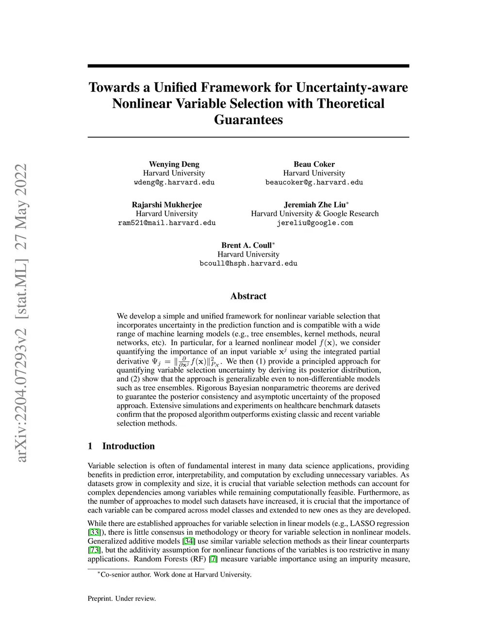 We develop a simple and unified framework for nonlinear variable selection that incorporates uncertainty in the prediction function and is compatible with a wide range of machine learning models (e.g., tree ensembles, kernel methods, neural networks, etc). In particular, for a learned nonlinear model , we consider quantifying the importance of an input variable using the integrated partial derivative . We then (1) provide a principled approach for quantifying variable selection uncertainty by deriving its posterior distribution, and (2) show that the approach is generalizable even to non-differentiable models such as tree ensembles. Rigorous Bayesian nonparametric theorems are derived to guarantee the posterior consistency and asymptotic uncertainty of the proposed approach. Extensive simulations and experiments on healthcare benchmark datasets confirm that the proposed algorithm outperforms existing classic and recent variable selection methods.
