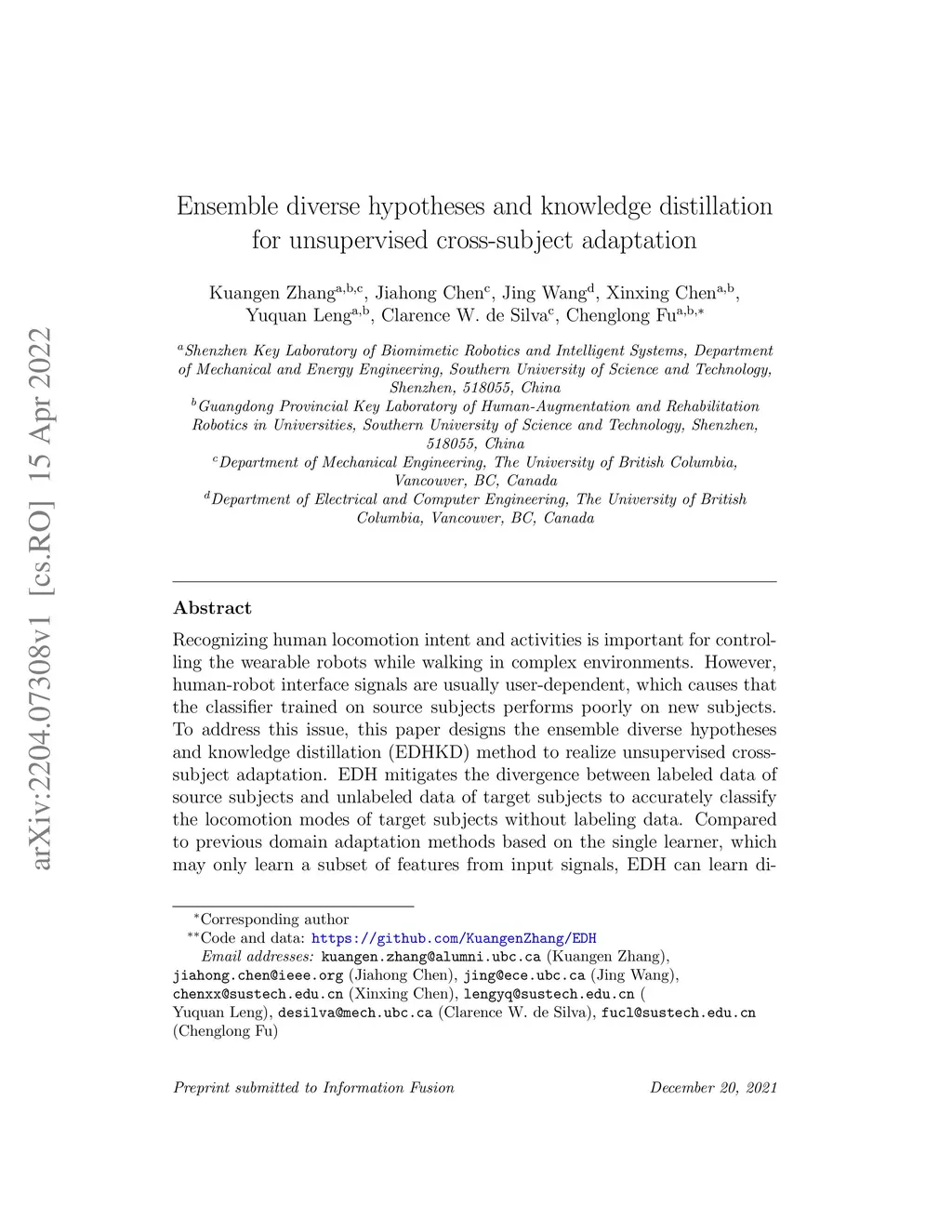 Recognizing human locomotion intent and activities is important for controlling the wearable robots while walking in complex environments. However, human-robot interface signals are usually user-dependent, which causes that the classifier trained on source subjects performs poorly on new subjects. To address this issue, this paper designs the ensemble diverse hypotheses and knowledge distillation (EDHKD) method to realize unsupervised cross-subject adaptation. EDH mitigates the divergence between labeled data of source subjects and unlabeled data of target subjects to accurately classify the locomotion modes of target subjects without labeling data. Compared to previous domain adaptation methods based on the single learner, which may only learn a subset of features from input signals, EDH can learn diverse features by incorporating multiple diverse feature generators and thus increases the accuracy and decreases the variance of classifying target data, but it sacrifices the efficiency. To solve this problem, EDHKD (student) distills the knowledge from the EDH (teacher) to a single network to remain efficient and accurate. The performance of the EDHKD is theoretically proved and experimentally validated on a 2D moon dataset and two public human locomotion datasets. Experimental results show that the EDHKD outperforms all other methods. The EDHKD can classify target data with 96.9%, 94.4%, and 97.4% average accuracy on the above three datasets with a short computing time (1 ms). Compared to a benchmark (BM) method, the EDHKD increases 1.3% and 7.1% average accuracy for classifying the locomotion modes of target subjects. The EDHKD also stabilizes the learning curves. Therefore, the EDHKD is significant for increasing the generalization ability and efficiency of the human intent prediction and human activity recognition system, which will improve human-robot interactions.
