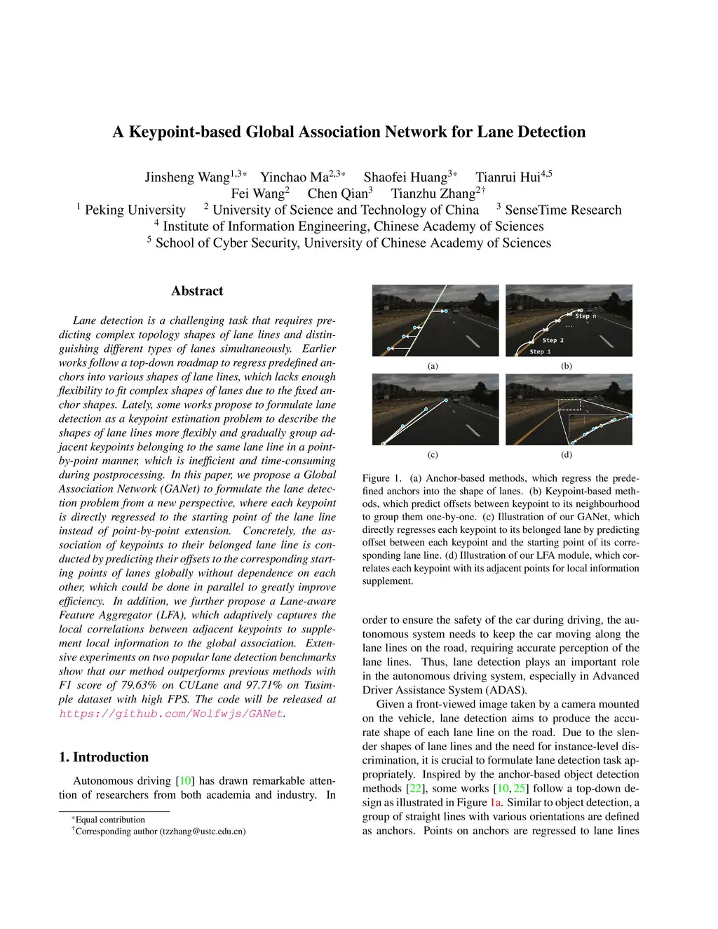 Lane detection is a challenging task that requires predicting complex topology shapes of lane lines and distinguishing different types of lanes simultaneously. Earlier works follow a top-down roadmap to regress predefined anchors into various shapes of lane lines, which lacks enough flexibility to fit complex shapes of lanes due to the fixed anchor shapes. Lately, some works propose to formulate lane detection as a keypoint estimation problem to describe the shapes of lane lines more flexibly and gradually group adjacent keypoints belonging to the same lane line in a point-by-point manner, which is inefficient and time-consuming during postprocessing. In this paper, we propose a Global Association Network (GANet) to formulate the lane detection problem from a new perspective, where each keypoint is directly regressed to the starting point of the lane line instead of point-by-point extension. Concretely, the association of keypoints to their belonged lane line is conducted by predicting their offsets to the corresponding starting points of lanes globally without dependence on each other, which could be done in parallel to greatly improve efficiency. In addition, we further propose a Lane-aware Feature Aggregator (LFA), which adaptively captures the local correlations between adjacent keypoints to supplement local information to the global association. Extensive experiments on two popular lane detection benchmarks show that our method outperforms previous methods with F1 score of 79.63% on CULane and 97.71% on Tusimple dataset with high FPS. The code will be released at https://github.com/Wolfwjs/GANet.