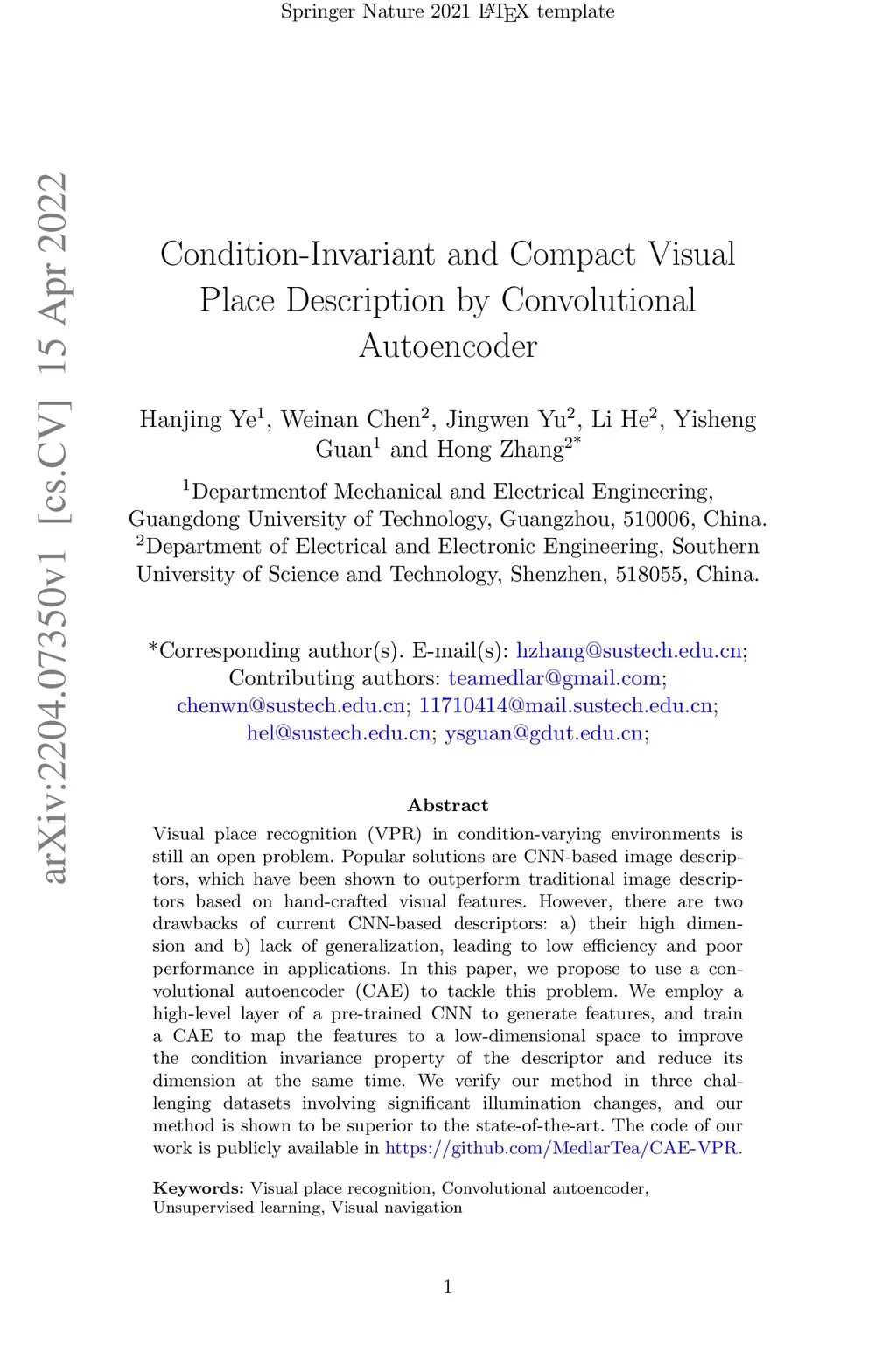 Visual place recognition (VPR) in condition-varying environments is still an open problem. Popular solutions are CNN-based image descriptors, which have been shown to outperform traditional image descriptors based on hand-crafted visual features. However, there are two drawbacks of current CNN-based descriptors: a) their high dimension and b) lack of generalization, leading to low efficiency and poor performance in applications. In this paper, we propose to use a convolutional autoencoder (CAE) to tackle this problem. We employ a high-level layer of a pre-trained CNN to generate features, and train a CAE to map the features to a low-dimensional space to improve the condition invariance property of the descriptor and reduce its dimension at the same time. We verify our method in three challenging datasets involving significant illumination changes, and our method is shown to be superior to the state-of-the-art. For the benefit of the community, we make public the source code.