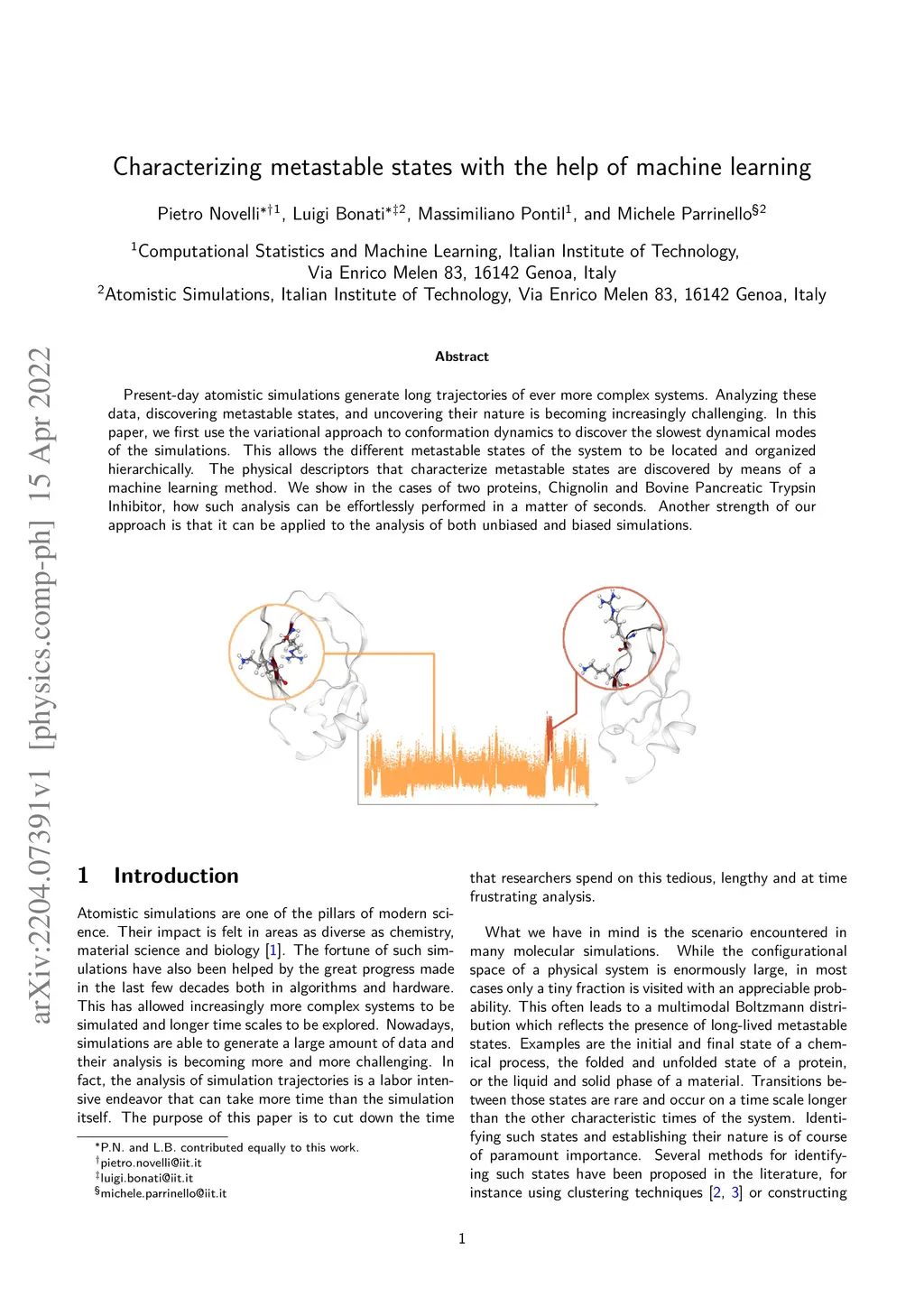 Present-day atomistic simulations generate long trajectories of ever more complex systems. Analyzing these data, discovering metastable states, and uncovering their nature is becoming increasingly challenging. In this paper, we first use the variational approach to conformation dynamics to discover the slowest dynamical modes of the simulations. This allows the different metastable states of the system to be located and organized hierarchically. The physical descriptors that characterize metastable states are discovered by means of a machine learning method. We show in the cases of two proteins, Chignolin and Bovine Pancreatic Trypsin Inhibitor, how such analysis can be effortlessly performed in a matter of seconds. Another strength of our approach is that it can be applied to the analysis of both unbiased and biased simulations.