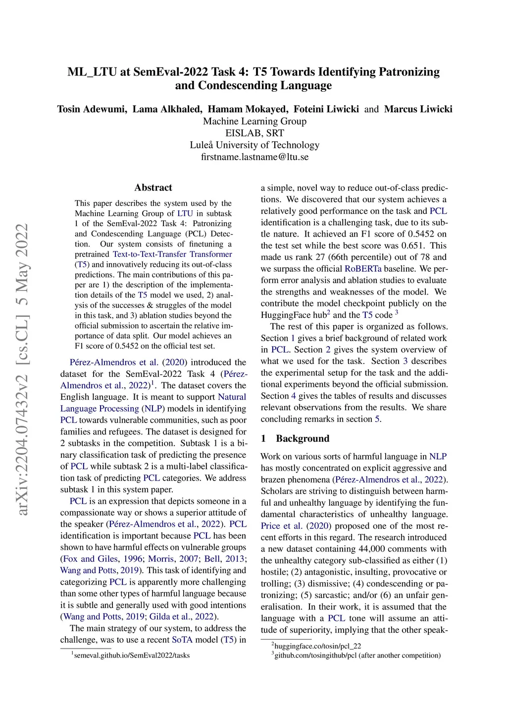 This paper describes the system used by the Machine Learning Group of LTU in subtask 1 of the SemEval-2022 Task 4: Patronizing and Condescending Language (PCL) Detection. Our system consists of finetuning a pretrained Text-to-Text-Transfer Transformer (T5) and innovatively reducing its out-of-class predictions. The main contributions of this paper are 1) the description of the implementation details of the T5 model we used, 2) analysis of the successes & struggles of the model in this task, and 3) ablation studies beyond the official submission to ascertain the relative importance of data split. Our model achieves an F1 score of 0.5452 on the official test set.