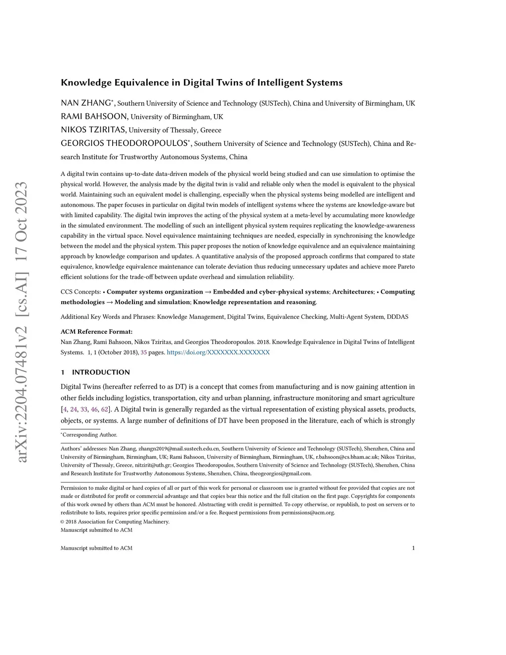 Knowledge Equivalence in Digital Twins of Intelligent Systems