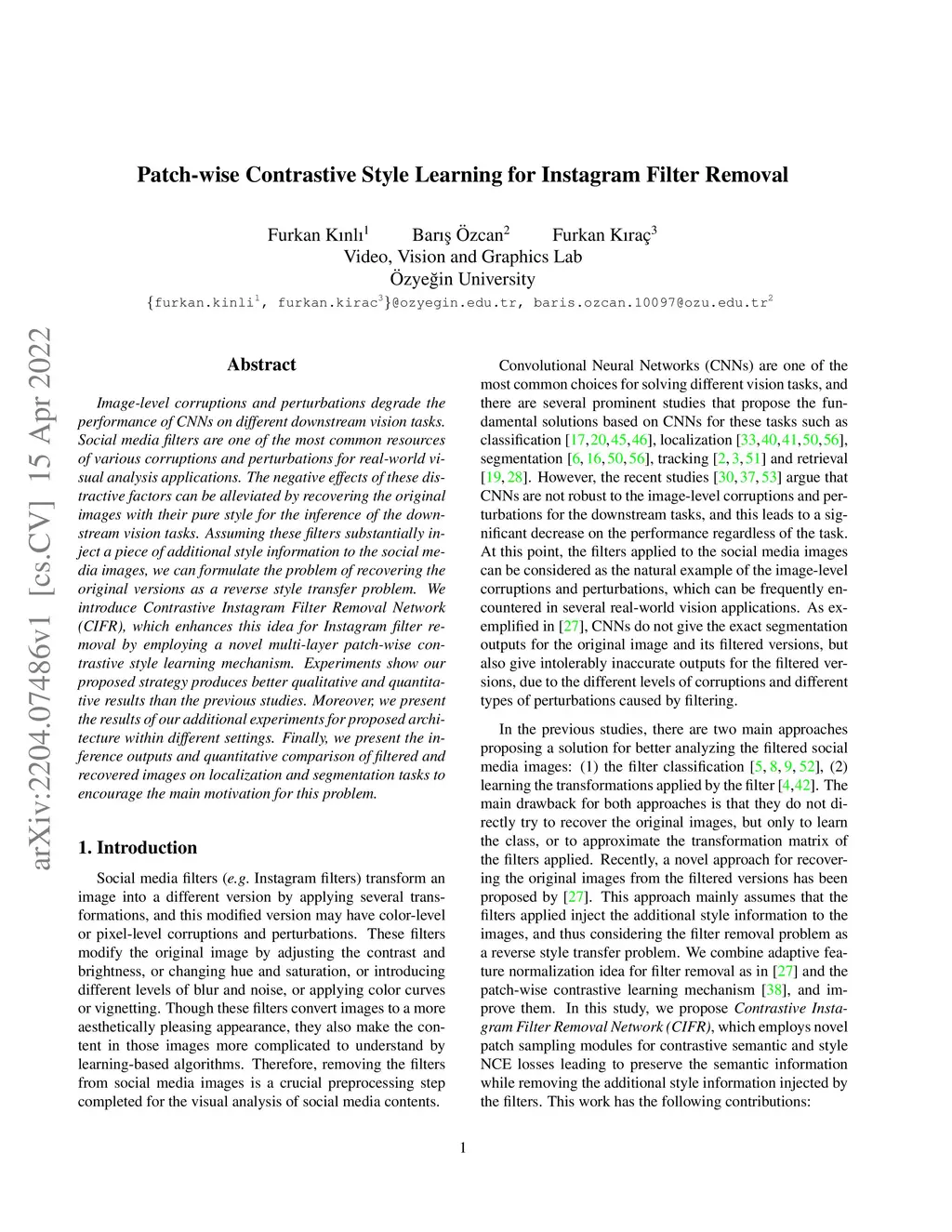 Image-level corruptions and perturbations degrade the performance of CNNs on different downstream vision tasks. Social media filters are one of the most common resources of various corruptions and perturbations for real-world visual analysis applications. The negative effects of these distractive factors can be alleviated by recovering the original images with their pure style for the inference of the downstream vision tasks. Assuming these filters substantially inject a piece of additional style information to the social media images, we can formulate the problem of recovering the original versions as a reverse style transfer problem. We introduce Contrastive Instagram Filter Removal Network (CIFR), which enhances this idea for Instagram filter removal by employing a novel multi-layer patch-wise contrastive style learning mechanism. Experiments show our proposed strategy produces better qualitative and quantitative results than the previous studies. Moreover, we present the results of our additional experiments for proposed architecture within different settings. Finally, we present the inference outputs and quantitative comparison of filtered and recovered images on localization and segmentation tasks to encourage the main motivation for this problem.