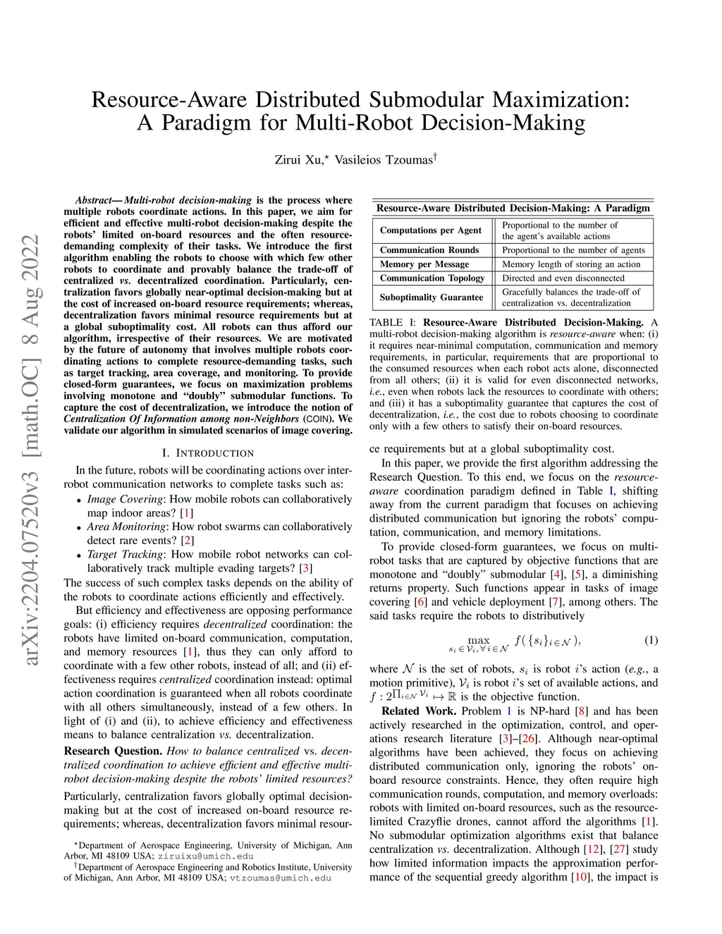 Multi-robot decision-making is the process where multiple robots coordinate actions. In this paper, we aim for efficient and effective multi-robot decision-making despite the robots' limited on-board resources and the often resource-demanding complexity of their tasks. We introduce the first algorithm enabling the robots to choose with which few other robots to coordinate and provably balance the trade-off of centralized vs. decentralized coordination. Particularly, centralization favors globally near-optimal decision-making but at the cost of increased on-board resource requirements; whereas, decentralization favors minimal resource requirements but at a global suboptimality cost. All robots can thus afford our algorithm, irrespective of their resources. We are motivated by the future of autonomy that involves multiple robots coordinating actions to complete resource-demanding tasks, such as target tracking, area coverage, and monitoring. To provide closed-form guarantees, we focus on maximization problems involving monotone and "doubly" submodular functions. To capture the cost of decentralization, we introduce the notion of Centralization Of Information among non-Neighbors (COIN). We validate our algorithm in simulated scenarios of image covering.