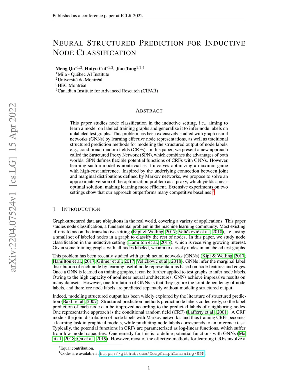 This paper studies node classification in the inductive setting, i.e., aiming to learn a model on labeled training graphs and generalize it to infer node labels on unlabeled test graphs. This problem has been extensively studied with graph neural networks (GNNs) by learning effective node representations, as well as traditional structured prediction methods for modeling the structured output of node labels, e.g., conditional random fields (CRFs). In this paper, we present a new approach called the Structured Proxy Network (SPN), which combines the advantages of both worlds. SPN defines flexible potential functions of CRFs with GNNs. However, learning such a model is nontrivial as it involves optimizing a maximin game with high-cost inference. Inspired by the underlying connection between joint and marginal distributions defined by Markov networks, we propose to solve an approximate version of the optimization problem as a proxy, which yields a near-optimal solution, making learning more efficient. Extensive experiments on two settings show that our approach outperforms many competitive baselines.