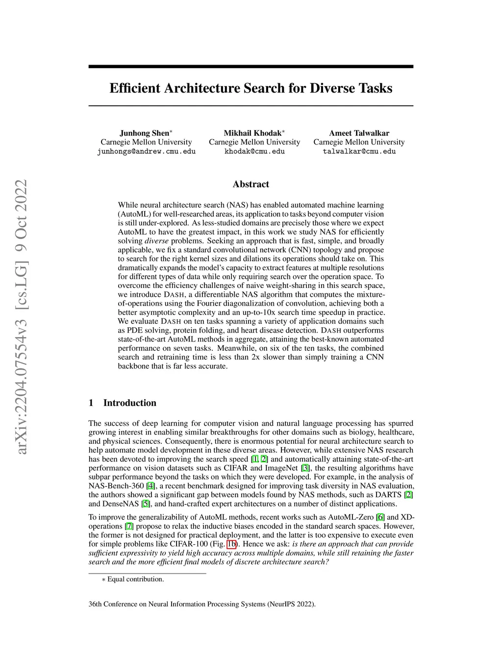 While neural architecture search (NAS) has enabled automated machine learning (AutoML) for well-researched areas, its application to tasks beyond computer vision is still under-explored. As less-studied domains are precisely those where we expect AutoML to have the greatest impact, in this work we study NAS for efficiently solving diverse problems. Seeking an approach that is fast, simple, and broadly applicable, we fix a standard convolutional network (CNN) topology and propose to search for the right kernel sizes and dilations its operations should take on. This dramatically expands the model's capacity to extract features at multiple resolutions for different types of data while only requiring search over the operation space. To overcome the efficiency challenges of naive weight-sharing in this search space, we introduce DASH, a differentiable NAS algorithm that computes the mixture-of-operations using the Fourier diagonalization of convolution, achieving both a better asymptotic complexity and an up-to-10x search time speedup in practice. We evaluate DASH on ten tasks spanning a variety of application domains such as PDE solving, protein folding, and heart disease detection. DASH outperforms state-of-the-art AutoML methods in aggregate, attaining the best-known automated performance on seven tasks. Meanwhile, on six of the ten tasks, the combined search and retraining time is less than 2x slower than simply training a CNN backbone that is far less accurate.