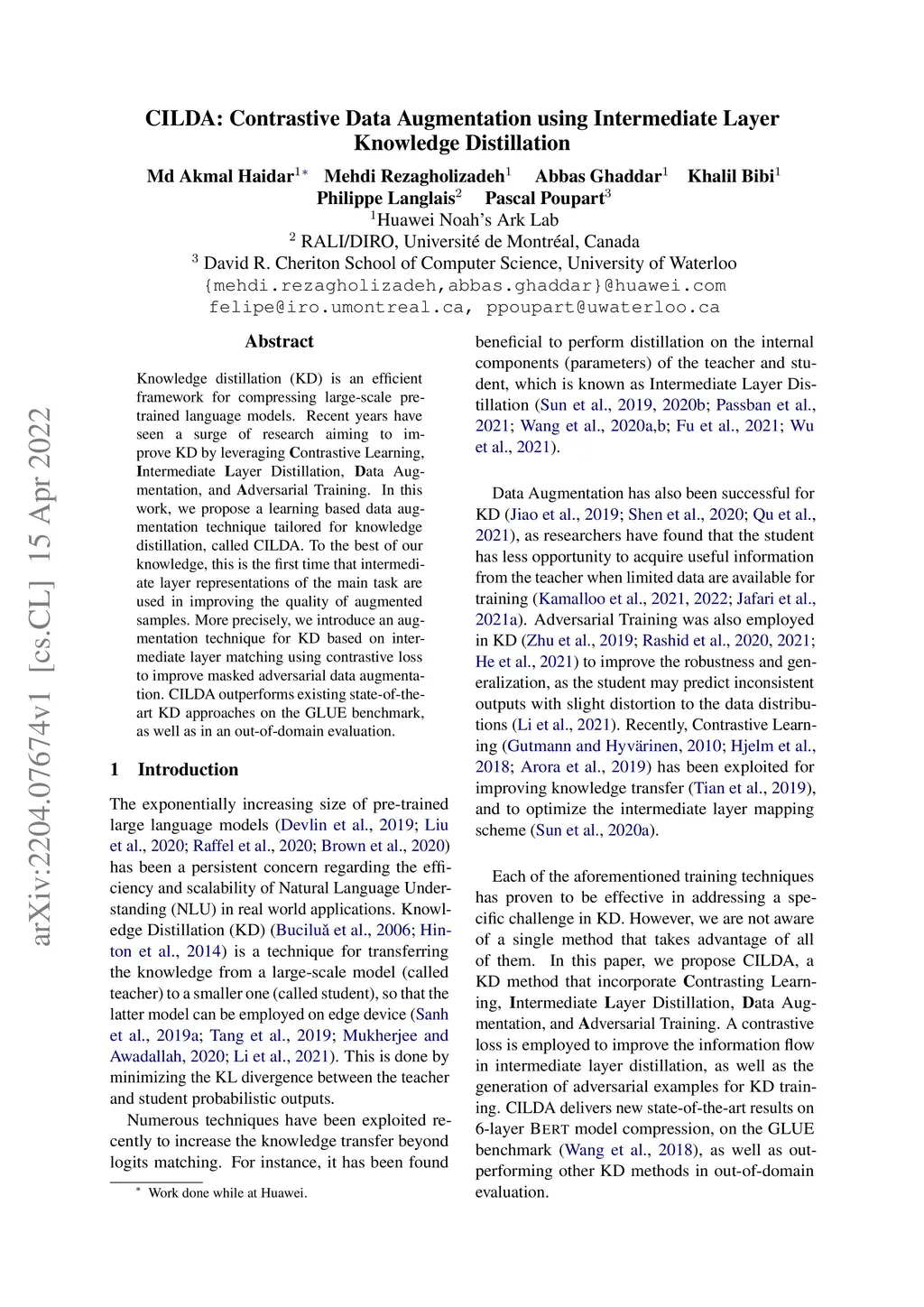 Knowledge distillation (KD) is an efficient framework for compressing large-scale pre-trained language models. Recent years have seen a surge of research aiming to improve KD by leveraging Contrastive Learning, Intermediate Layer Distillation, Data Augmentation, and Adversarial Training. In this work, we propose a learning based data augmentation technique tailored for knowledge distillation, called CILDA. To the best of our knowledge, this is the first time that intermediate layer representations of the main task are used in improving the quality of augmented samples. More precisely, we introduce an augmentation technique for KD based on intermediate layer matching using contrastive loss to improve masked adversarial data augmentation. CILDA outperforms existing state-of-the-art KD approaches on the GLUE benchmark, as well as in an out-of-domain evaluation.