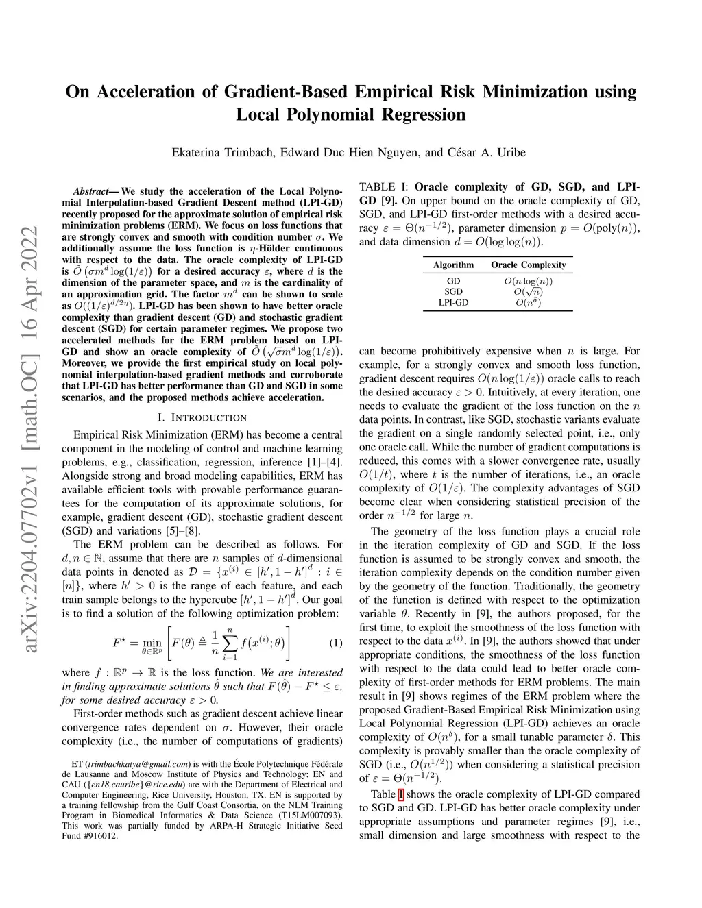 We study the acceleration of the Local Polynomial Interpolation-based Gradient Descent method (LPI-GD) recently proposed for the approximate solution of empirical risk minimization problems (ERM). We focus on loss functions that are strongly convex and smooth with condition number . We additionally assume the loss function is -H\"older continuous with respect to the data. The oracle complexity of LPI-GD is for a desired accuracy , where is the dimension of the parameter space, and is the cardinality of an approximation grid. The factor can be shown to scale as . LPI-GD has been shown to have better oracle complexity than gradient descent (GD) and stochastic gradient descent (SGD) for certain parameter regimes. We propose two accelerated methods for the ERM problem based on LPI-GD and show an oracle complexity of . Moreover, we provide the first empirical study on local polynomial interpolation-based gradient methods and corroborate that LPI-GD has better performance than GD and SGD in some scenarios, and the proposed methods achieve acceleration.