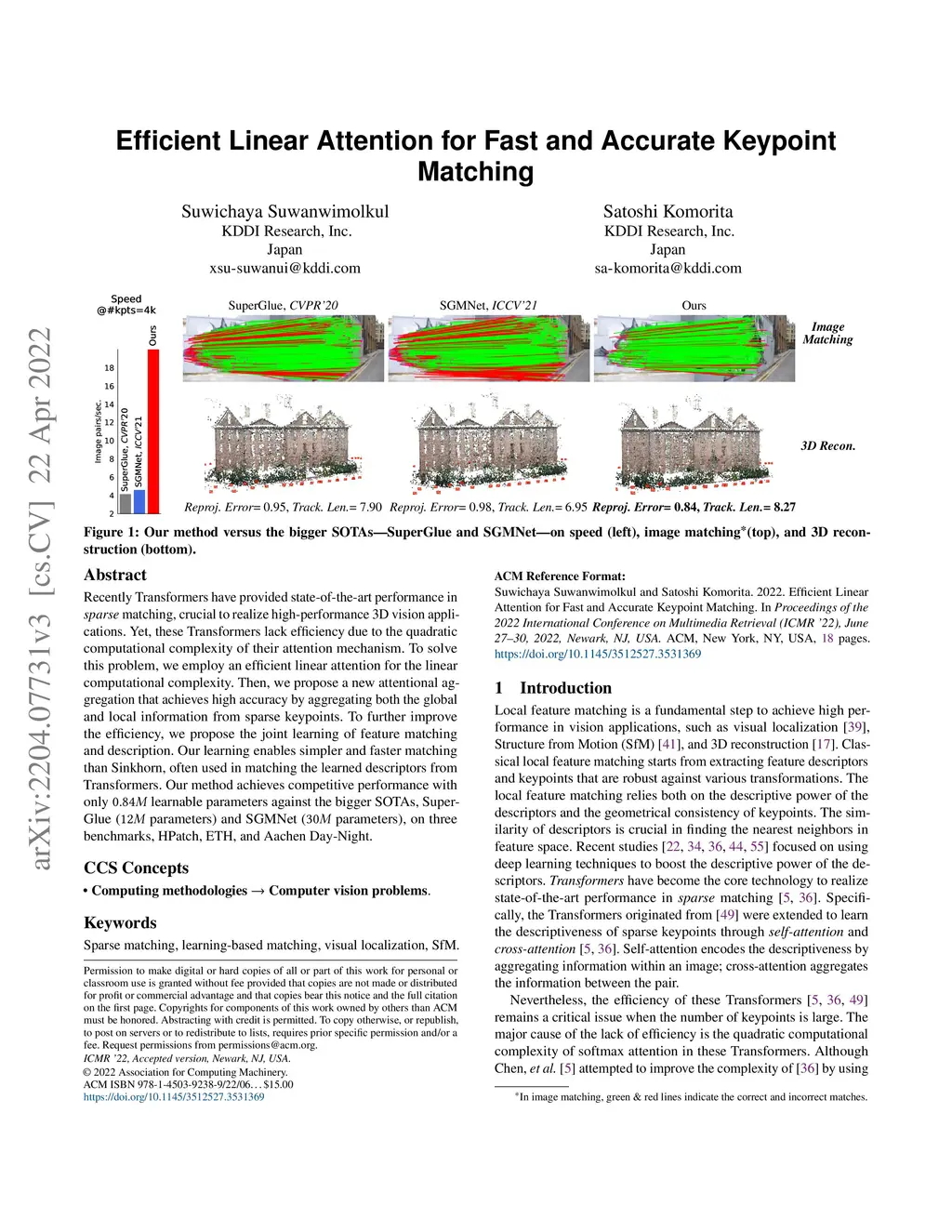 Recently Transformers have provided state-of-the-art performance in sparse matching, crucial to realize high-performance 3D vision applications. Yet, these Transformers lack efficiency due to the quadratic computational complexity of their attention mechanism. To solve this problem, we employ an efficient linear attention for the linear computational complexity. Then, we propose a new attentional aggregation that achieves high accuracy by aggregating both the global and local information from sparse keypoints. To further improve the efficiency, we propose the joint learning of feature matching and description. Our learning enables simpler and faster matching than Sinkhorn, often used in matching the learned descriptors from Transformers. Our method achieves competitive performance with only 0.84M learnable parameters against the bigger SOTAs, SuperGlue (12M parameters) and SGMNet (30M parameters), on three benchmarks, HPatch, ETH, and Aachen Day-Night.