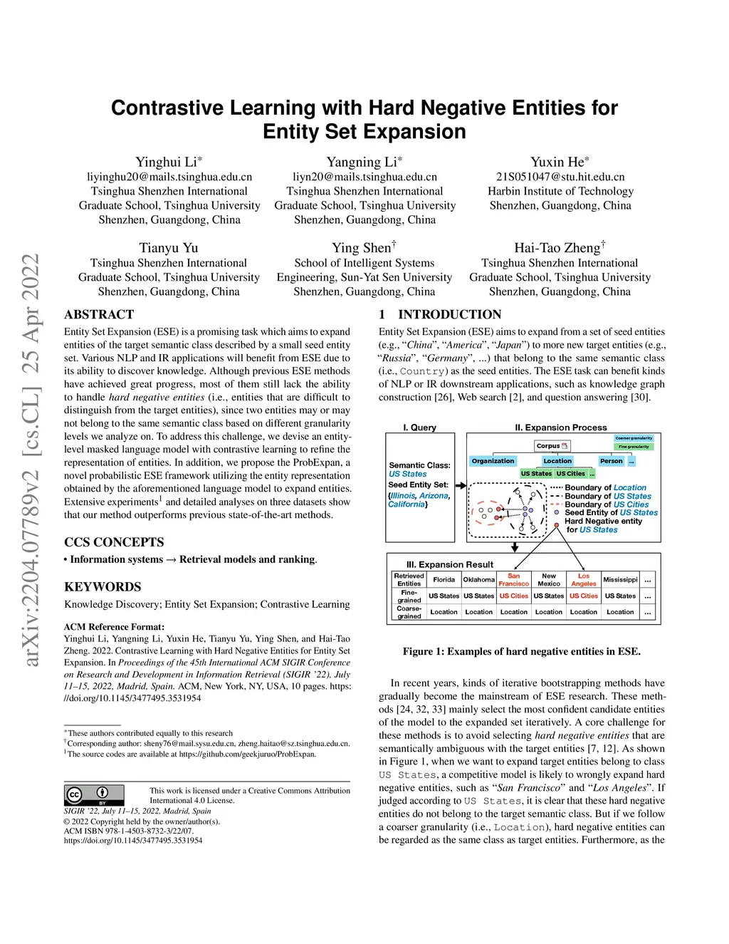 Entity Set Expansion (ESE) is a promising task which aims to expand entities of the target semantic class described by a small seed entity set. Various NLP and IR applications will benefit from ESE due to its ability to discover knowledge. Although previous ESE methods have achieved great progress, most of them still lack the ability to handle hard negative entities (i.e., entities that are difficult to distinguish from the target entities), since two entities may or may not belong to the same semantic class based on different granularity levels we analyze on. To address this challenge, we devise an entity-level masked language model with contrastive learning to refine the representation of entities. In addition, we propose the ProbExpan, a novel probabilistic ESE framework utilizing the entity representation obtained by the aforementioned language model to expand entities. Extensive experiments and detailed analyses on three datasets show that our method outperforms previous state-of-the-art methods.