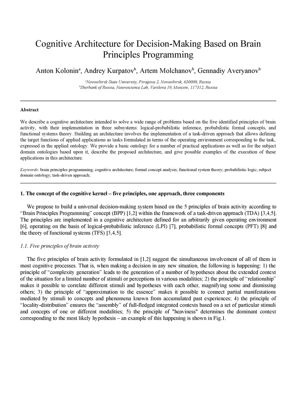 We describe a cognitive architecture intended to solve a wide range of problems based on the five identified principles of brain activity, with their implementation in three subsystems: logical-probabilistic inference, probabilistic formal concepts, and functional systems theory. Building an architecture involves the implementation of a task-driven approach that allows defining the target functions of applied applications as tasks formulated in terms of the operating environment corresponding to the task, expressed in the applied ontology. We provide a basic ontology for a number of practical applications as well as for the subject domain ontologies based upon it, describe the proposed architecture, and give possible examples of the execution of these applications in this architecture.