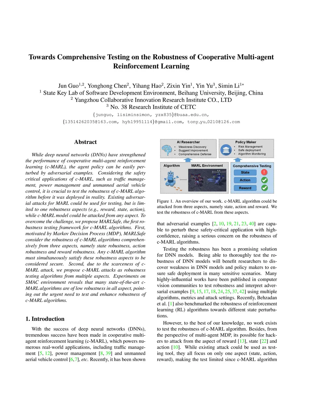 While deep neural networks (DNNs) have strengthened the performance of cooperative multi-agent reinforcement learning (c-MARL), the agent policy can be easily perturbed by adversarial examples. Considering the safety critical applications of c-MARL, such as traffic management, power management and unmanned aerial vehicle control, it is crucial to test the robustness of c-MARL algorithm before it was deployed in reality. Existing adversarial attacks for MARL could be used for testing, but is limited to one robustness aspects (e.g., reward, state, action), while c-MARL model could be attacked from any aspect. To overcome the challenge, we propose MARLSafe, the first robustness testing framework for c-MARL algorithms. First, motivated by Markov Decision Process (MDP), MARLSafe consider the robustness of c-MARL algorithms comprehensively from three aspects, namely state robustness, action robustness and reward robustness. Any c-MARL algorithm must simultaneously satisfy these robustness aspects to be considered secure. Second, due to the scarceness of c-MARL attack, we propose c-MARL attacks as robustness testing algorithms from multiple aspects. Experiments on \textit{SMAC} environment reveals that many state-of-the-art c-MARL algorithms are of low robustness in all aspect, pointing out the urgent need to test and enhance robustness of c-MARL algorithms.