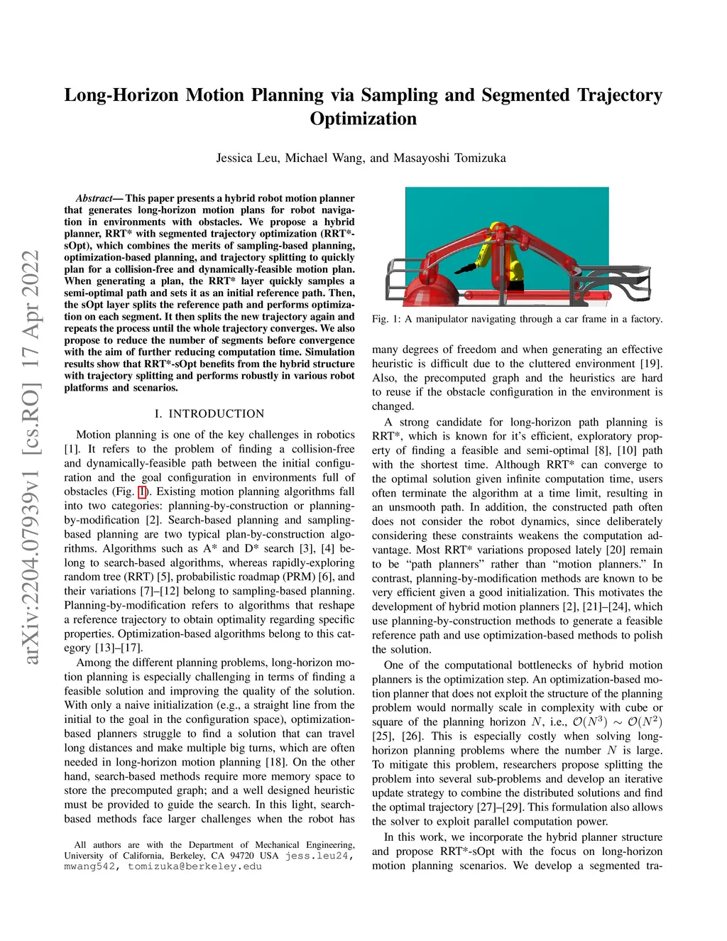 This paper presents a hybrid robot motion planner that generates long-horizon motion plans for robot navigation in environments with obstacles. We propose a hybrid planner, RRT* with segmented trajectory optimization (RRT*-sOpt), which combines the merits of sampling-based planning, optimization-based planning, and trajectory splitting to quickly plan for a collision-free and dynamically-feasible motion plan. When generating a plan, the RRT* layer quickly samples a semi-optimal path and sets it as an initial reference path. Then, the sOpt layer splits the reference path and performs optimization on each segment. It then splits the new trajectory again and repeats the process until the whole trajectory converges. We also propose to reduce the number of segments before convergence with the aim of further reducing computation time. Simulation results show that RRT*-sOpt benefits from the hybrid structure with trajectory splitting and performs robustly in various robot platforms and scenarios.