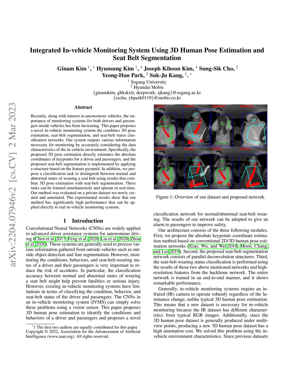 Recently, along with interest in autonomous vehicles, the importance of monitoring systems for both drivers and passengers inside vehicles has been increasing. This paper proposes a novel in-vehicle monitoring system the combines 3D pose estimation, seat-belt segmentation, and seat-belt status classification networks. Our system outputs various information necessary for monitoring by accurately considering the data characteristics of the in-vehicle environment. Specifically, the proposed 3D pose estimation directly estimates the absolute coordinates of keypoints for a driver and passengers, and the proposed seat-belt segmentation is implemented by applying a structure based on the feature pyramid. In addition, we propose a classification task to distinguish between normal and abnormal states of wearing a seat belt using results that combine 3D pose estimation with seat-belt segmentation. These tasks can be learned simultaneously and operate in real-time. Our method was evaluated on a private dataset we newly created and annotated. The experimental results show that our method has significantly high performance that can be applied directly to real in-vehicle monitoring systems.