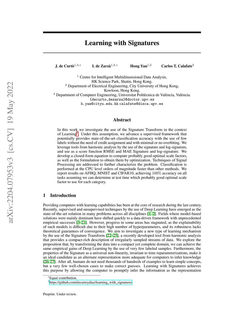 In this work we investigate the use of the Signature Transform in the context of Learning. Under this assumption, we advance a supervised framework that potentially provides state-of-the-art classification accuracy with the use of few labels without the need of credit assignment and with minimal or no overfitting. We leverage tools from harmonic analysis by the use of the signature and log-signature, and use as a score function RMSE and MAE Signature and log-signature. We develop a closed-form equation to compute probably good optimal scale factors, as well as the formulation to obtain them by optimization. Techniques of Signal Processing are addressed to further characterize the problem. Classification is performed at the CPU level orders of magnitude faster than other methods. We report results on AFHQ, MNIST and CIFAR10, achieving 100% accuracy on all tasks assuming we can determine at test time which probably good optimal scale factor to use for each category.