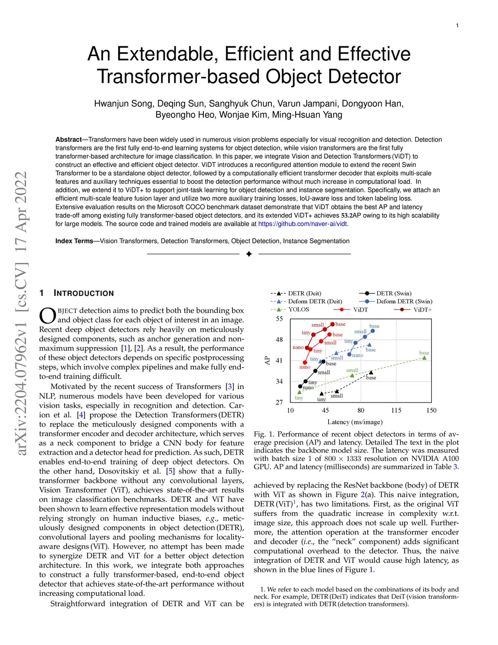 Transformers have been widely used in numerous vision problems especially for visual recognition and detection. Detection transformers are the first fully end-to-end learning systems for object detection, while vision transformers are the first fully transformer-based architecture for image classification. In this paper, we integrate Vision and Detection Transformers (ViDT) to construct an effective and efficient object detector. ViDT introduces a reconfigured attention module to extend the recent Swin Transformer to be a standalone object detector, followed by a computationally efficient transformer decoder that exploits multi-scale features and auxiliary techniques essential to boost the detection performance without much increase in computational load. In addition, we extend it to ViDT+ to support joint-task learning for object detection and instance segmentation. Specifically, we attach an efficient multi-scale feature fusion layer and utilize two more auxiliary training losses, IoU-aware loss and token labeling loss. Extensive evaluation results on the Microsoft COCO benchmark dataset demonstrate that ViDT obtains the best AP and latency trade-off among existing fully transformer-based object detectors, and its extended ViDT+ achieves 53.2AP owing to its high scalability for large models. The source code and trained models are available at https://github.com/naver-ai/vidt.