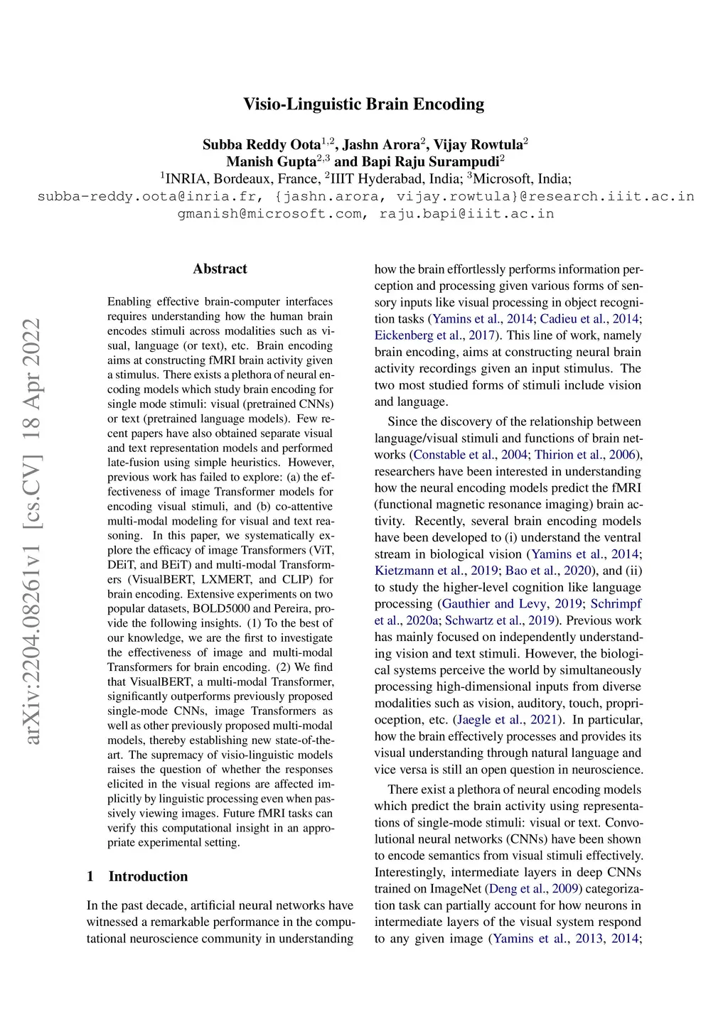 Enabling effective brain-computer interfaces requires understanding how the human brain encodes stimuli across modalities such as visual, language (or text), etc. Brain encoding aims at constructing fMRI brain activity given a stimulus. There exists a plethora of neural encoding models which study brain encoding for single mode stimuli: visual (pretrained CNNs) or text (pretrained language models). Few recent papers have also obtained separate visual and text representation models and performed late-fusion using simple heuristics. However, previous work has failed to explore: (a) the effectiveness of image Transformer models for encoding visual stimuli, and (b) co-attentive multi-modal modeling for visual and text reasoning. In this paper, we systematically explore the efficacy of image Transformers (ViT, DEiT, and BEiT) and multi-modal Transformers (VisualBERT, LXMERT, and CLIP) for brain encoding. Extensive experiments on two popular datasets, BOLD5000 and Pereira, provide the following insights. (1) To the best of our knowledge, we are the first to investigate the effectiveness of image and multi-modal Transformers for brain encoding. (2) We find that VisualBERT, a multi-modal Transformer, significantly outperforms previously proposed single-mode CNNs, image Transformers as well as other previously proposed multi-modal models, thereby establishing new state-of-the-art. The supremacy of visio-linguistic models raises the question of whether the responses elicited in the visual regions are affected implicitly by linguistic processing even when passively viewing images. Future fMRI tasks can verify this computational insight in an appropriate experimental setting.