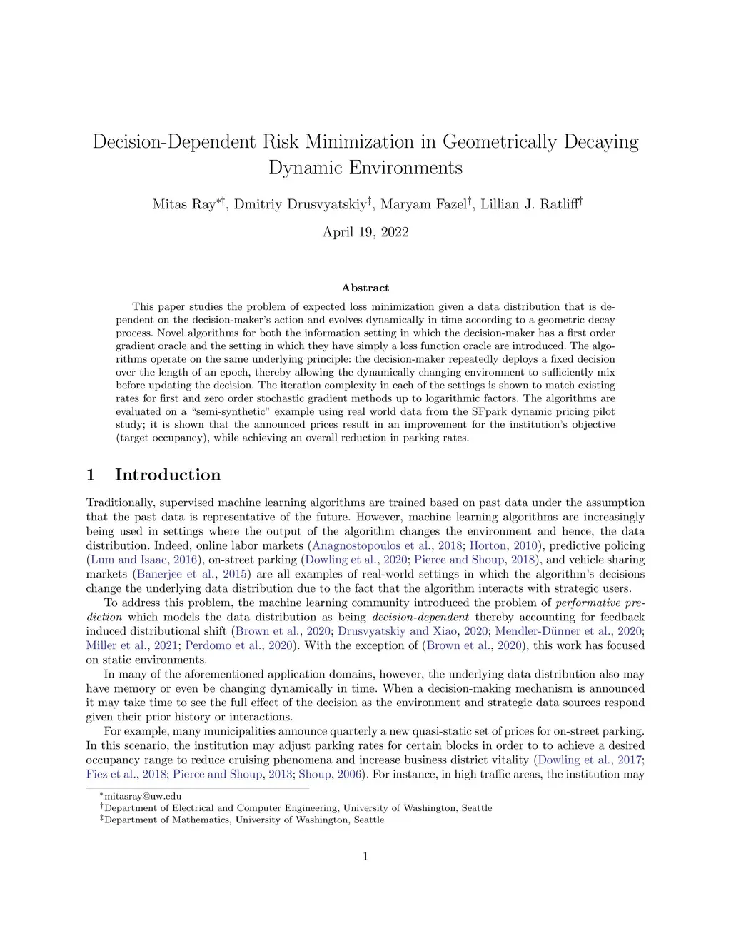 This paper studies the problem of expected loss minimization given a data distribution that is dependent on the decision-maker's action and evolves dynamically in time according to a geometric decay process. Novel algorithms for both the information setting in which the decision-maker has a first order gradient oracle and the setting in which they have simply a loss function oracle are introduced. The algorithms operate on the same underlying principle: the decision-maker repeatedly deploys a fixed decision over the length of an epoch, thereby allowing the dynamically changing environment to sufficiently mix before updating the decision. The iteration complexity in each of the settings is shown to match existing rates for first and zero order stochastic gradient methods up to logarithmic factors. The algorithms are evaluated on a "semi-synthetic" example using real world data from the SFpark dynamic pricing pilot study; it is shown that the announced prices result in an improvement for the institution's objective (target occupancy), while achieving an overall reduction in parking rates.