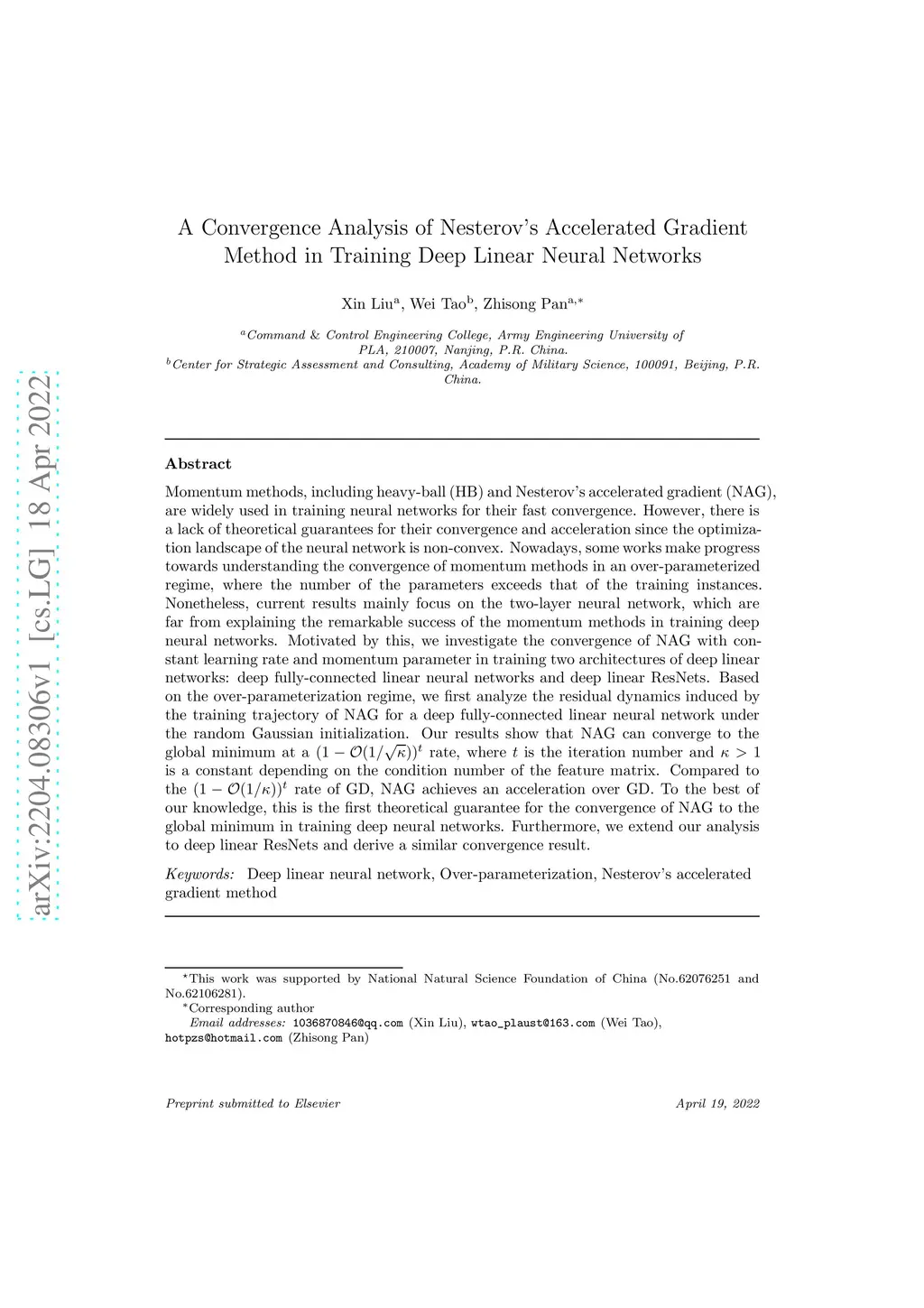 Momentum methods, including heavy-ball~(HB) and Nesterov's accelerated gradient~(NAG), are widely used in training neural networks for their fast convergence. However, there is a lack of theoretical guarantees for their convergence and acceleration since the optimization landscape of the neural network is non-convex. Nowadays, some works make progress towards understanding the convergence of momentum methods in an over-parameterized regime, where the number of the parameters exceeds that of the training instances. Nonetheless, current results mainly focus on the two-layer neural network, which are far from explaining the remarkable success of the momentum methods in training deep neural networks. Motivated by this, we investigate the convergence of NAG with constant learning rate and momentum parameter in training two architectures of deep linear networks: deep fully-connected linear neural networks and deep linear ResNets. Based on the over-parameterization regime, we first analyze the residual dynamics induced by the training trajectory of NAG for a deep fully-connected linear neural network under the random Gaussian initialization. Our results show that NAG can converge to the global minimum at a rate, where is the iteration number and is a constant depending on the condition number of the feature matrix. Compared to the rate of GD, NAG achieves an acceleration over GD. To the best of our knowledge, this is the first theoretical guarantee for the convergence of NAG to the global minimum in training deep neural networks. Furthermore, we extend our analysis to deep linear ResNets and derive a similar convergence result.