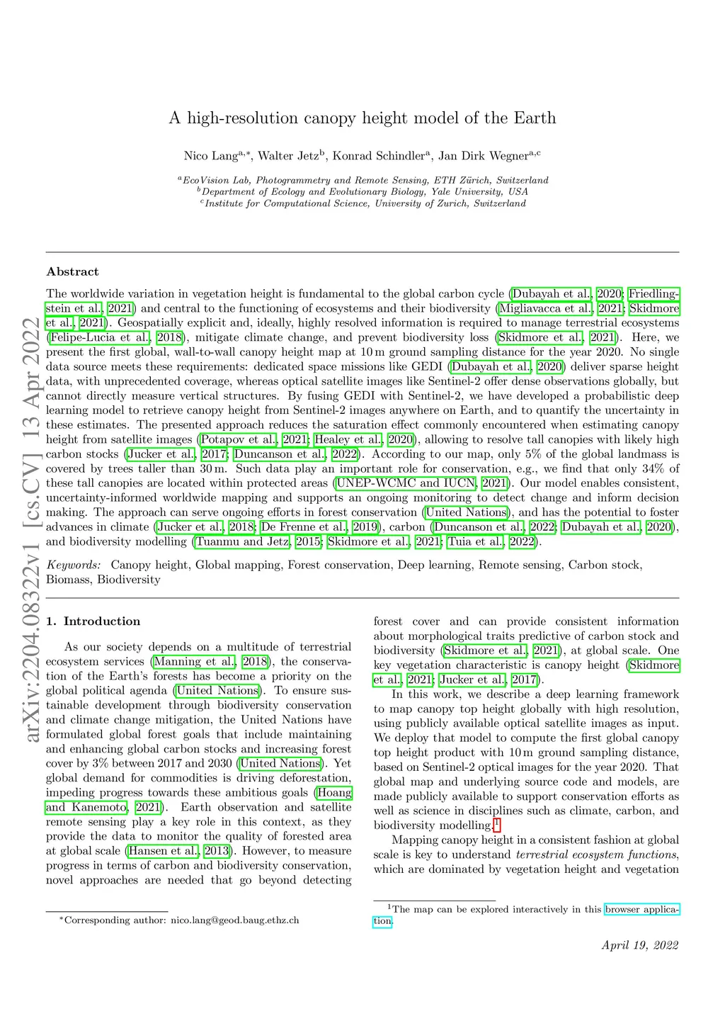 The worldwide variation in vegetation height is fundamental to the global carbon cycle and central to the functioning of ecosystems and their biodiversity. Geospatially explicit and, ideally, highly resolved information is required to manage terrestrial ecosystems, mitigate climate change, and prevent biodiversity loss. Here, we present the first global, wall-to-wall canopy height map at 10 m ground sampling distance for the year 2020. No single data source meets these requirements: dedicated space missions like GEDI deliver sparse height data, with unprecedented coverage, whereas optical satellite images like Sentinel-2 offer dense observations globally, but cannot directly measure vertical structures. By fusing GEDI with Sentinel-2, we have developed a probabilistic deep learning model to retrieve canopy height from Sentinel-2 images anywhere on Earth, and to quantify the uncertainty in these estimates. The presented approach reduces the saturation effect commonly encountered when estimating canopy height from satellite images, allowing to resolve tall canopies with likely high carbon stocks. According to our map, only 5% of the global landmass is covered by trees taller than 30 m. Such data play an important role for conservation, e.g., we find that only 34% of these tall canopies are located within protected areas. Our model enables consistent, uncertainty-informed worldwide mapping and supports an ongoing monitoring to detect change and inform decision making. The approach can serve ongoing efforts in forest conservation, and has the potential to foster advances in climate, carbon, and biodiversity modelling.