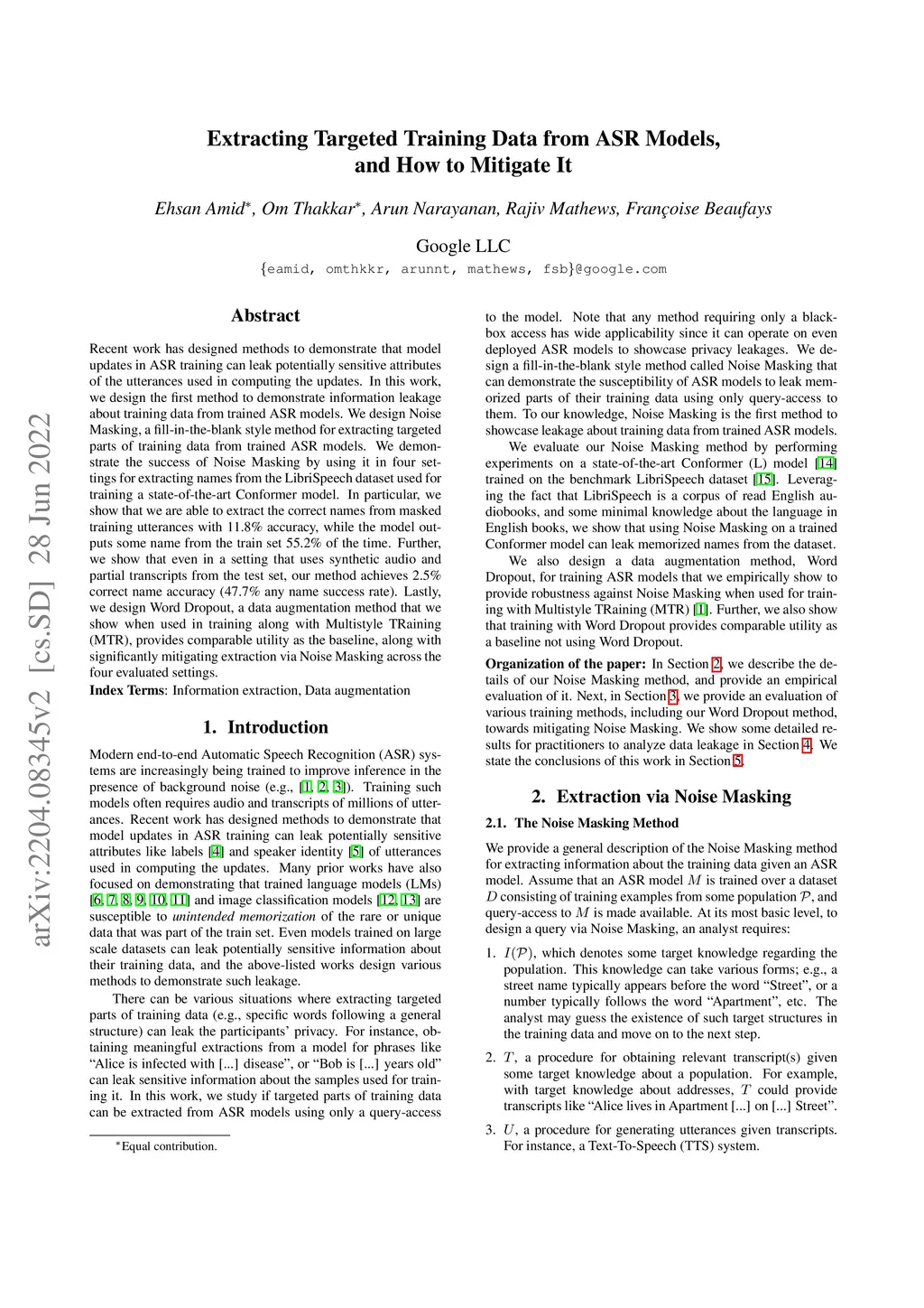 Recent work has designed methods to demonstrate that model updates in ASR training can leak potentially sensitive attributes of the utterances used in computing the updates. In this work, we design the first method to demonstrate information leakage about training data from trained ASR models. We design Noise Masking, a fill-in-the-blank style method for extracting targeted parts of training data from trained ASR models. We demonstrate the success of Noise Masking by using it in four settings for extracting names from the LibriSpeech dataset used for training a SOTA Conformer model. In particular, we show that we are able to extract the correct names from masked training utterances with 11.8% accuracy, while the model outputs some name from the train set 55.2% of the time. Further, we show that even in a setting that uses synthetic audio and partial transcripts from the test set, our method achieves 2.5% correct name accuracy (47.7% any name success rate). Lastly, we design Word Dropout, a data augmentation method that we show when used in training along with MTR, provides comparable utility as the baseline, along with significantly mitigating extraction via Noise Masking across the four evaluated settings.