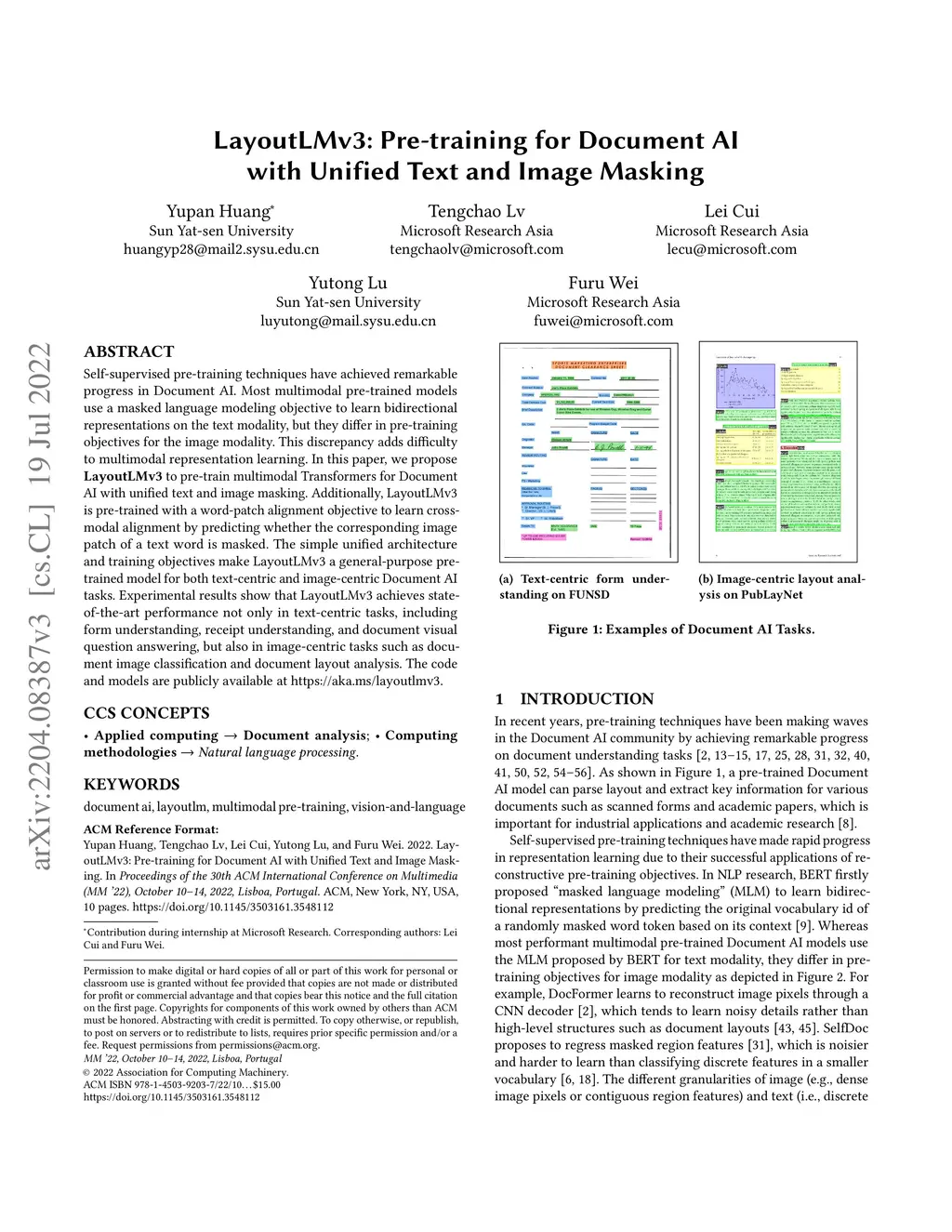 Self-supervised pre-training techniques have achieved remarkable progress in Document AI. Most multimodal pre-trained models use a masked language modeling objective to learn bidirectional representations on the text modality, but they differ in pre-training objectives for the image modality. This discrepancy adds difficulty to multimodal representation learning. In this paper, we propose \textbf{LayoutLMv3} to pre-train multimodal Transformers for Document AI with unified text and image masking. Additionally, LayoutLMv3 is pre-trained with a word-patch alignment objective to learn cross-modal alignment by predicting whether the corresponding image patch of a text word is masked. The simple unified architecture and training objectives make LayoutLMv3 a general-purpose pre-trained model for both text-centric and image-centric Document AI tasks. Experimental results show that LayoutLMv3 achieves state-of-the-art performance not only in text-centric tasks, including form understanding, receipt understanding, and document visual question answering, but also in image-centric tasks such as document image classification and document layout analysis. The code and models are publicly available at \url{https://aka.ms/layoutlmv3}.
