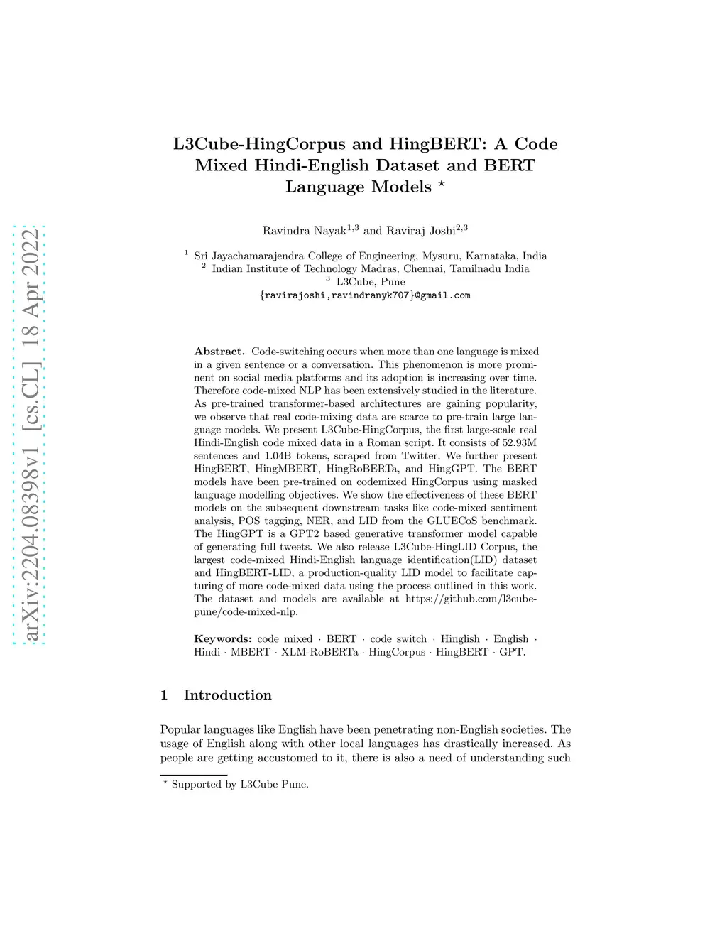 L3Cube-HingCorpus and HingBERT: A Code Mixed Hindi-English Dataset and
