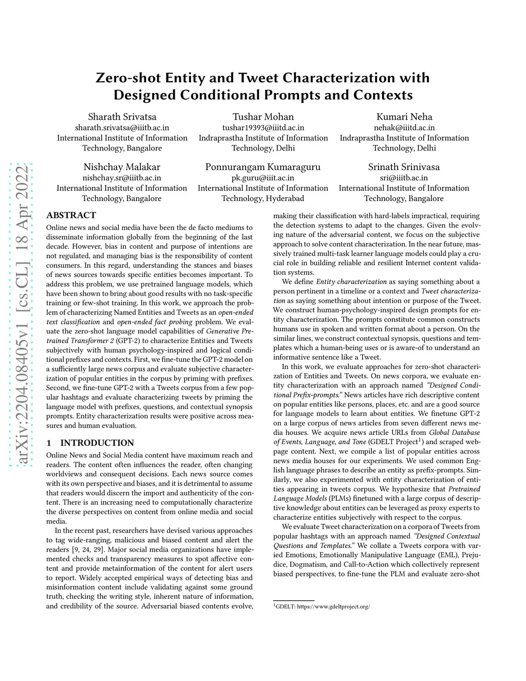 Online news and social media have been the de facto mediums to disseminate information globally from the beginning of the last decade. However, bias in content and purpose of intentions are not regulated, and managing bias is the responsibility of content consumers. In this regard, understanding the stances and biases of news sources towards specific entities becomes important. To address this problem, we use pretrained language models, which have been shown to bring about good results with no task-specific training or few-shot training. In this work, we approach the problem of characterizing Named Entities and Tweets as an open-ended text classification and open-ended fact probing problem.We evaluate the zero-shot language model capabilities of Generative Pretrained Transformer 2 (GPT-2) to characterize Entities and Tweets subjectively with human psychology-inspired and logical conditional prefixes and contexts. First, we fine-tune the GPT-2 model on a sufficiently large news corpus and evaluate subjective characterization of popular entities in the corpus by priming with prefixes. Second, we fine-tune GPT-2 with a Tweets corpus from a few popular hashtags and evaluate characterizing tweets by priming the language model with prefixes, questions, and contextual synopsis prompts. Entity characterization results were positive across measures and human evaluation.