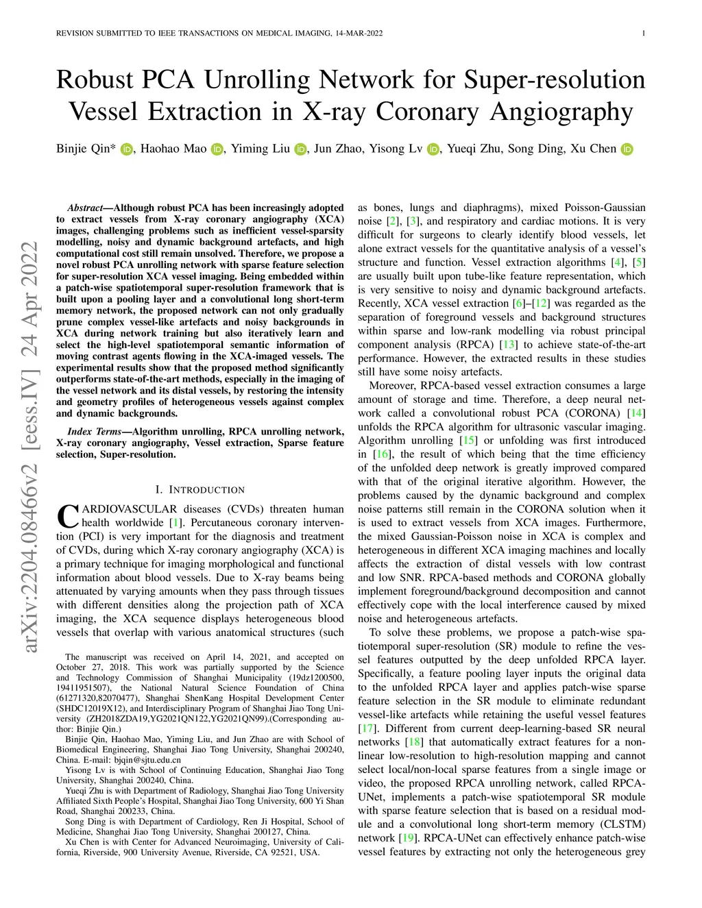 Although robust PCA has been increasingly adopted to extract vessels from X-ray coronary angiography (XCA) images, challenging problems such as inefficient vessel-sparsity modelling, noisy and dynamic background artefacts, and high computational cost still remain unsolved. Therefore, we propose a novel robust PCA unrolling network with sparse feature selection for super-resolution XCA vessel imaging. Being embedded within a patch-wise spatiotemporal super-resolution framework that is built upon a pooling layer and a convolutional long short-term memory network, the proposed network can not only gradually prune complex vessel-like artefacts and noisy backgrounds in XCA during network training but also iteratively learn and select the high-level spatiotemporal semantic information of moving contrast agents flowing in the XCA-imaged vessels. The experimental results show that the proposed method significantly outperforms state-of-the-art methods, especially in the imaging of the vessel network and its distal vessels, by restoring the intensity and geometry profiles of heterogeneous vessels against complex and dynamic backgrounds.