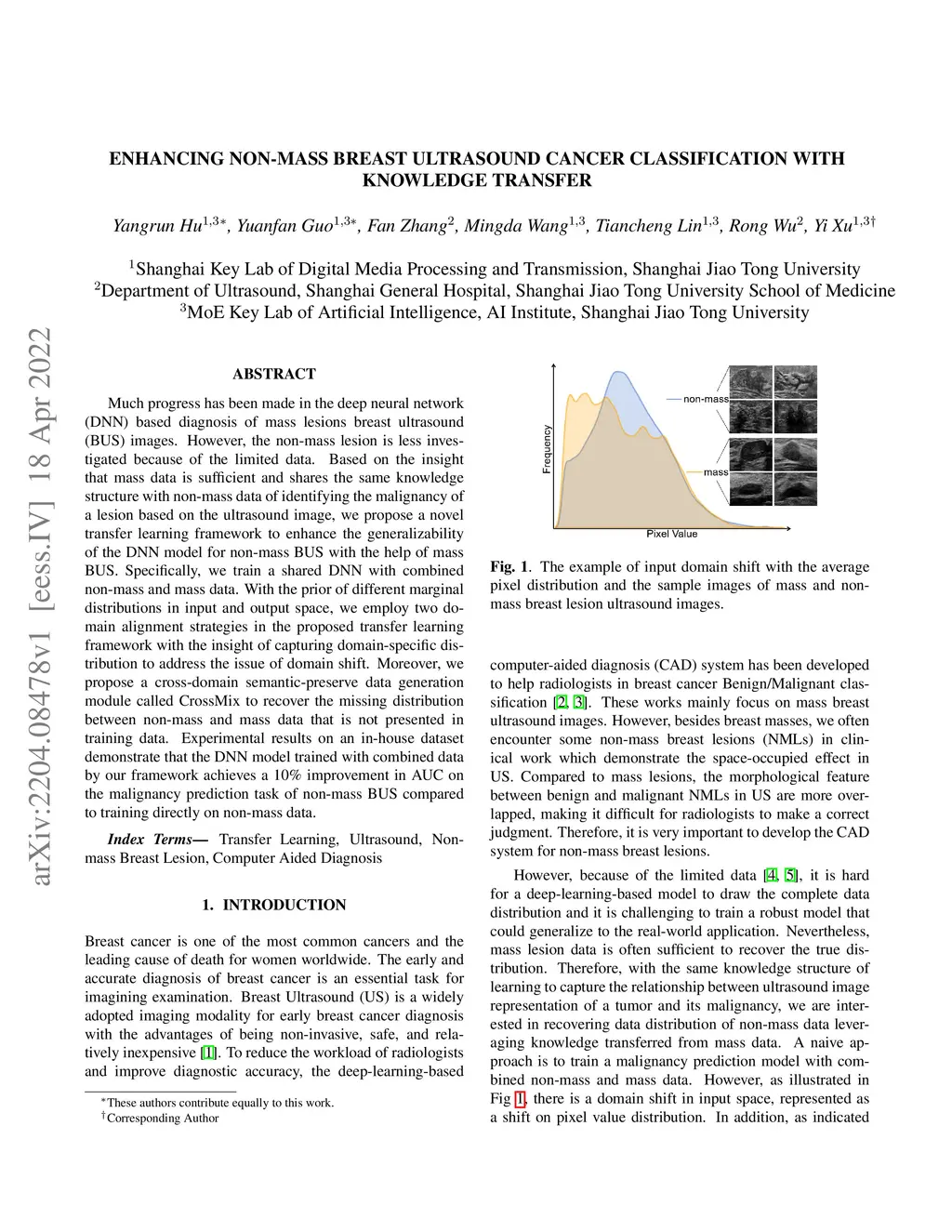 Much progress has been made in the deep neural network (DNN) based diagnosis of mass lesions breast ultrasound (BUS) images. However, the non-mass lesion is less investigated because of the limited data. Based on the insight that mass data is sufficient and shares the same knowledge structure with non-mass data of identifying the malignancy of a lesion based on the ultrasound image, we propose a novel transfer learning framework to enhance the generalizability of the DNN model for non-mass BUS with the help of mass BUS. Specifically, we train a shared DNN with combined non-mass and mass data. With the prior of different marginal distributions in input and output space, we employ two domain alignment strategies in the proposed transfer learning framework with the insight of capturing domain-specific distribution to address the issue of domain shift. Moreover, we propose a cross-domain semantic-preserve data generation module called CrossMix to recover the missing distribution between non-mass and mass data that is not presented in training data. Experimental results on an in-house dataset demonstrate that the DNN model trained with combined data by our framework achieves a 10% improvement in AUC on the malignancy prediction task of non-mass BUS compared to training directly on non-mass data.