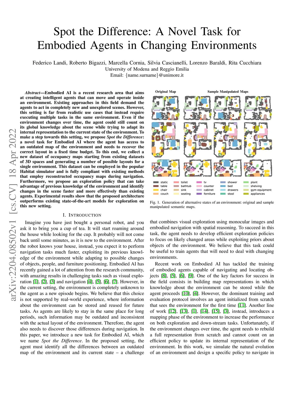 Embodied AI is a recent research area that aims at creating intelligent agents that can move and operate inside an environment. Existing approaches in this field demand the agents to act in completely new and unexplored scenes. However, this setting is far from realistic use cases that instead require executing multiple tasks in the same environment. Even if the environment changes over time, the agent could still count on its global knowledge about the scene while trying to adapt its internal representation to the current state of the environment. To make a step towards this setting, we propose Spot the Difference: a novel task for Embodied AI where the agent has access to an outdated map of the environment and needs to recover the correct layout in a fixed time budget. To this end, we collect a new dataset of occupancy maps starting from existing datasets of 3D spaces and generating a number of possible layouts for a single environment. This dataset can be employed in the popular Habitat simulator and is fully compliant with existing methods that employ reconstructed occupancy maps during navigation. Furthermore, we propose an exploration policy that can take advantage of previous knowledge of the environment and identify changes in the scene faster and more effectively than existing agents. Experimental results show that the proposed architecture outperforms existing state-of-the-art models for exploration on this new setting.