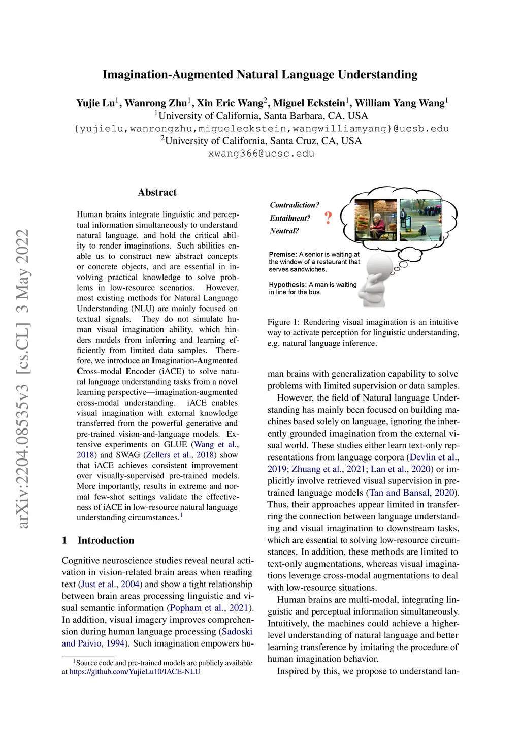 Human brains integrate linguistic and perceptual information simultaneously to understand natural language, and hold the critical ability to render imaginations. Such abilities enable us to construct new abstract concepts or concrete objects, and are essential in involving practical knowledge to solve problems in low-resource scenarios. However, most existing methods for Natural Language Understanding (NLU) are mainly focused on textual signals. They do not simulate human visual imagination ability, which hinders models from inferring and learning efficiently from limited data samples. Therefore, we introduce an Imagination-Augmented Cross-modal Encoder (iACE) to solve natural language understanding tasks from a novel learning perspective -- imagination-augmented cross-modal understanding. iACE enables visual imagination with external knowledge transferred from the powerful generative and pre-trained vision-and-language models. Extensive experiments on GLUE and SWAG show that iACE achieves consistent improvement over visually-supervised pre-trained models. More importantly, results in extreme and normal few-shot settings validate the effectiveness of iACE in low-resource natural language understanding circumstances.