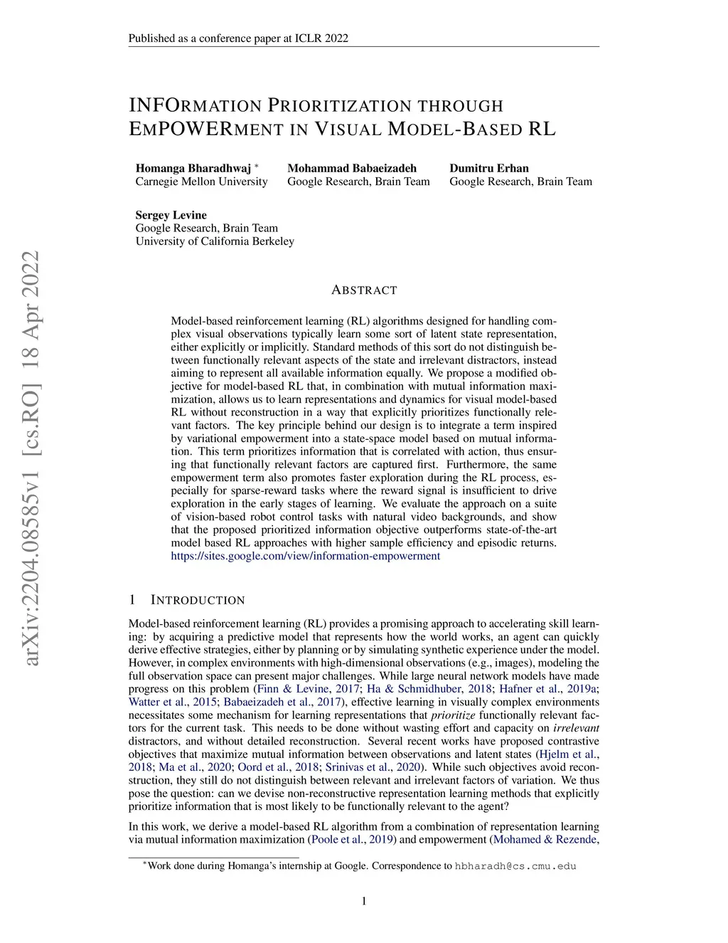 Model-based reinforcement learning (RL) algorithms designed for handling complex visual observations typically learn some sort of latent state representation, either explicitly or implicitly. Standard methods of this sort do not distinguish between functionally relevant aspects of the state and irrelevant distractors, instead aiming to represent all available information equally. We propose a modified objective for model-based RL that, in combination with mutual information maximization, allows us to learn representations and dynamics for visual model-based RL without reconstruction in a way that explicitly prioritizes functionally relevant factors. The key principle behind our design is to integrate a term inspired by variational empowerment into a state-space model based on mutual information. This term prioritizes information that is correlated with action, thus ensuring that functionally relevant factors are captured first. Furthermore, the same empowerment term also promotes faster exploration during the RL process, especially for sparse-reward tasks where the reward signal is insufficient to drive exploration in the early stages of learning. We evaluate the approach on a suite of vision-based robot control tasks with natural video backgrounds, and show that the proposed prioritized information objective outperforms state-of-the-art model based RL approaches with higher sample efficiency and episodic returns. https://sites.google.com/view/information-empowerment