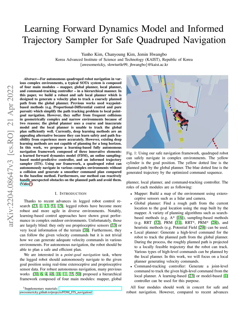 For autonomous quadruped robot navigation in various complex environments, a typical SOTA system is composed of four main modules -- mapper, global planner, local planner, and command-tracking controller -- in a hierarchical manner. In this paper, we build a robust and safe local planner which is designed to generate a velocity plan to track a coarsely planned path from the global planner. Previous works used waypoint-based methods (e.g. Proportional-Differential control and pure pursuit) which simplify the path tracking problem to local point-goal navigation. However, they suffer from frequent collisions in geometrically complex and narrow environments because of two reasons; the global planner uses a coarse and inaccurate model and the local planner is unable to track the global plan sufficiently well. Currently, deep learning methods are an appealing alternative because they can learn safety and path feasibility from experience more accurately. However, existing deep learning methods are not capable of planning for a long horizon. In this work, we propose a learning-based fully autonomous navigation framework composed of three innovative elements: a learned forward dynamics model (FDM), an online sampling-based model-predictive controller, and an informed trajectory sampler (ITS). Using our framework, a quadruped robot can autonomously navigate in various complex environments without a collision and generate a smoother command plan compared to the baseline method. Furthermore, our method can reactively handle unexpected obstacles on the planned path and avoid them. Project page https://awesomericky.github.io/projects/FDM_ITS_navigation/.