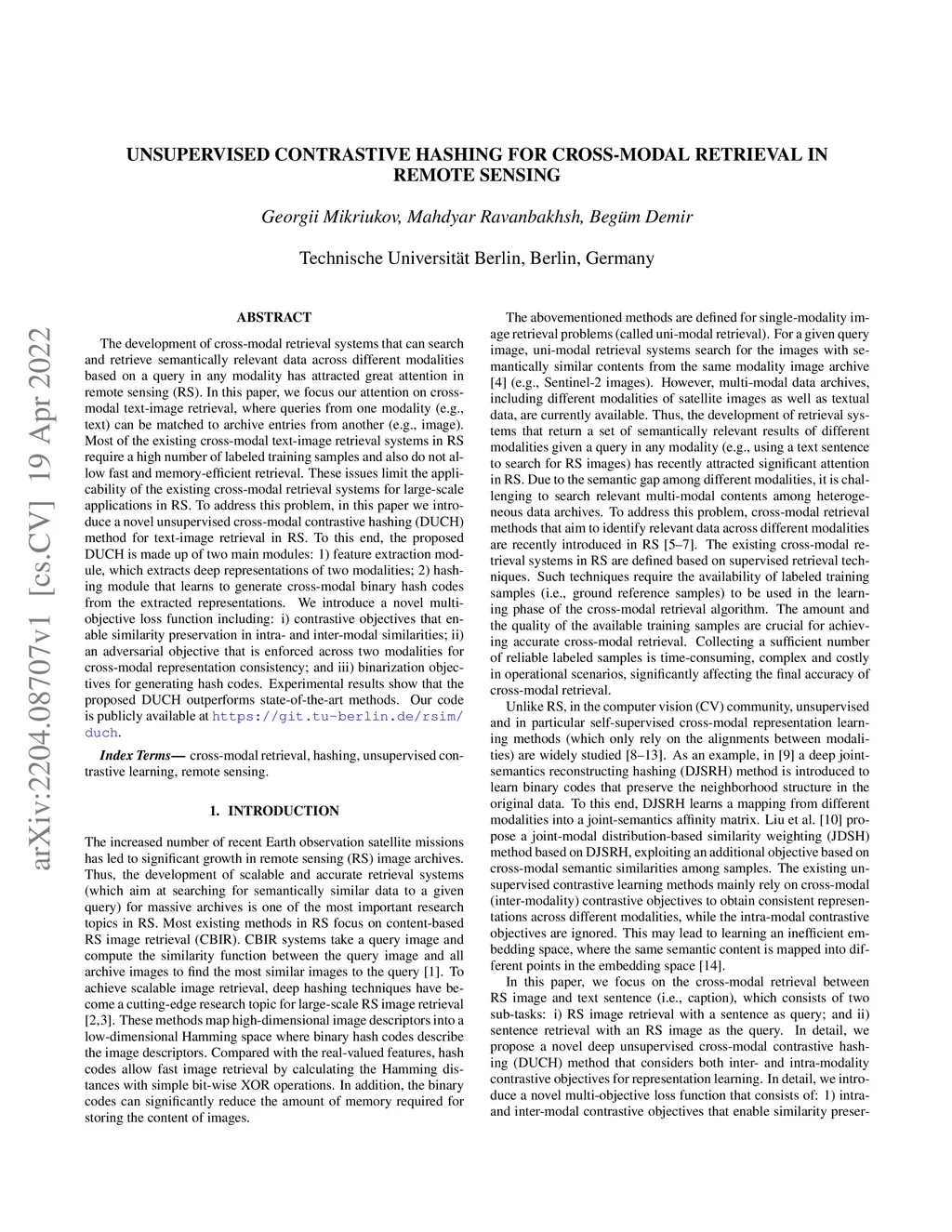 Unsupervised Contrastive Hashing for Cross-Modal Retrieval in Remote