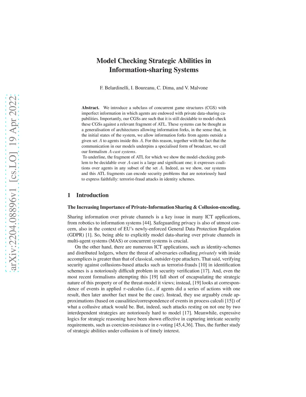 We introduce a subclass of concurrent game structures (CGS) with imperfect information in which agents are endowed with private data-sharing capabilities. Importantly, our CGSs are such that it is still decidable to model-check these CGSs against a relevant fragment of ATL. These systems can be thought as a generalisation of architectures allowing information forks, in the sense that, in the initial states of the system, we allow information forks from agents outside a given set A to agents inside this A. For this reason, together with the fact that the communication in our models underpins a specialised form of broadcast, we call our formalism A-cast systems. To underline, the fragment of ATL for which we show the model-checking problem to be decidable over A-cast is a large and significant one; it expresses coalitions over agents in any subset of the set A. Indeed, as we show, our systems and this ATL fragments can encode security problems that are notoriously hard to express faithfully: terrorist-fraud attacks in identity schemes.
