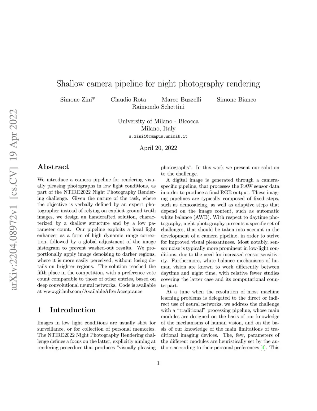 Shallow camera pipeline for night photography rendering