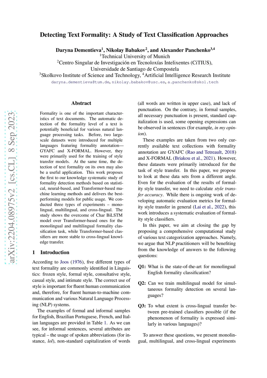 Formality is one of the important characteristics of text documents. The automatic detection of the formality level of a text is potentially beneficial for various natural language processing tasks. Before, two large-scale datasets were introduced for multiple languages featuring formality annotation -- GYAFC and X-FORMAL. However, they were primarily used for the training of style transfer models. At the same time, the detection of text formality on its own may also be a useful application. This work proposes the first to our knowledge systematic study of formality detection methods based on statistical, neural-based, and Transformer-based machine learning methods and delivers the best-performing models for public usage. We conducted three types of experiments -- monolingual, multilingual, and cross-lingual. The study shows the overcome of Char BiLSTM model over Transformer-based ones for the monolingual and multilingual formality classification task, while Transformer-based classifiers are more stable to cross-lingual knowledge transfer.