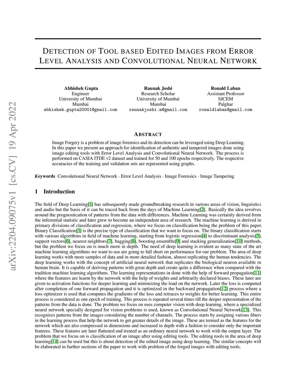 Image Forgery is a problem of image forensics and its detection can be leveraged using Deep Learning. In this paper we present an approach for identification of authentic and tampered images done using image editing tools with Error Level Analysis and Convolutional Neural Network. The process is performed on CASIA ITDE v2 dataset and trained for 50 and 100 epochs respectively. The respective accuracies of the training and validation sets are represented using graphs.