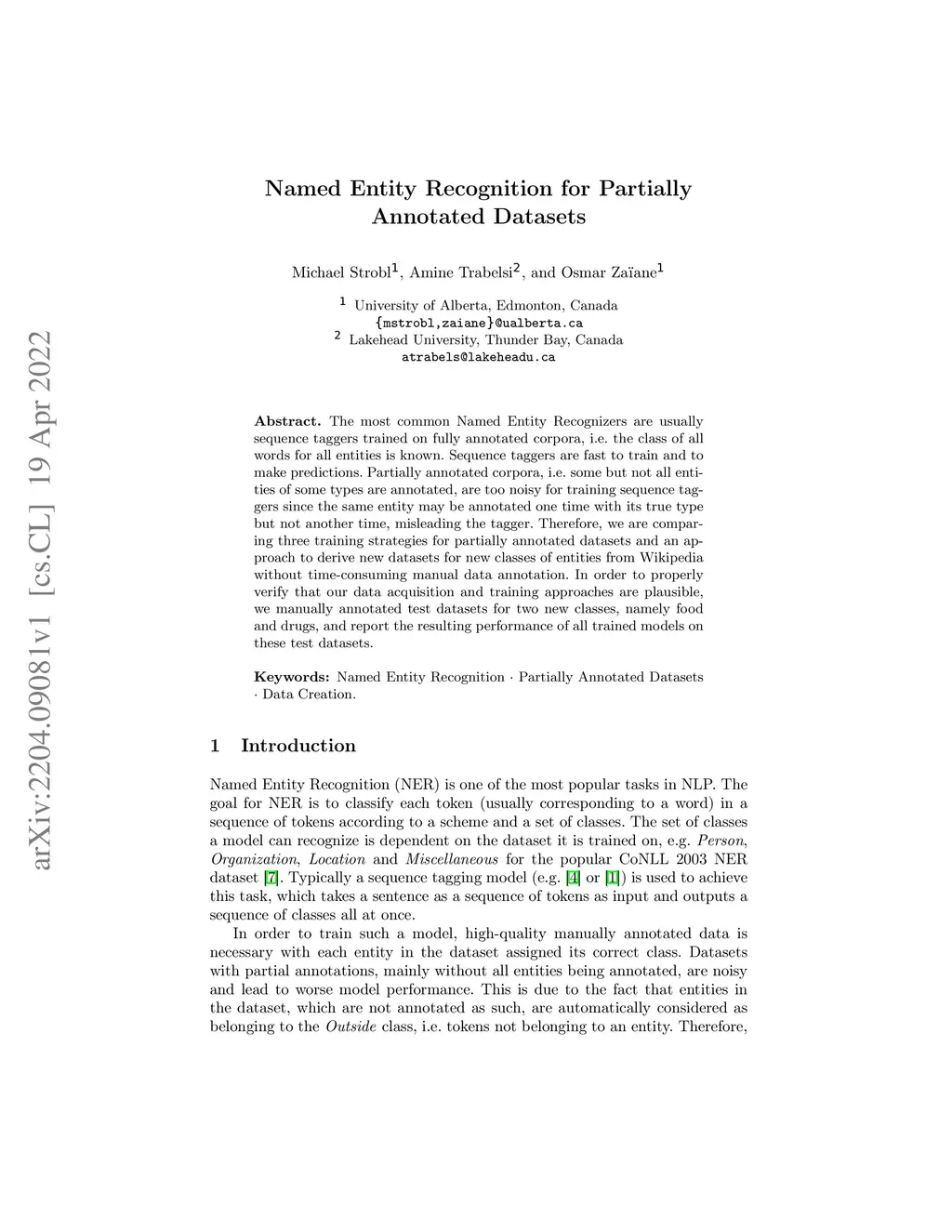The most common Named Entity Recognizers are usually sequence taggers trained on fully annotated corpora, i.e. the class of all words for all entities is known. Partially annotated corpora, i.e. some but not all entities of some types are annotated, are too noisy for training sequence taggers since the same entity may be annotated one time with its true type but not another time, misleading the tagger. Therefore, we are comparing three training strategies for partially annotated datasets and an approach to derive new datasets for new classes of entities from Wikipedia without time-consuming manual data annotation. In order to properly verify that our data acquisition and training approaches are plausible, we manually annotated test datasets for two new classes, namely food and drugs.