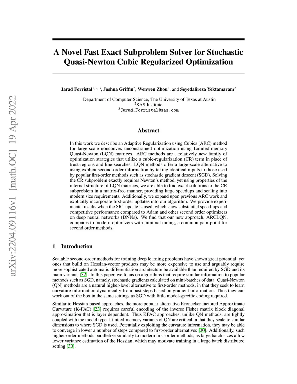 In this work we describe an Adaptive Regularization using Cubics (ARC) method for large-scale nonconvex unconstrained optimization using Limited-memory Quasi-Newton (LQN) matrices. ARC methods are a relatively new family of optimization strategies that utilize a cubic-regularization (CR) term in place of trust-regions and line-searches. LQN methods offer a large-scale alternative to using explicit second-order information by taking identical inputs to those used by popular first-order methods such as stochastic gradient descent (SGD). Solving the CR subproblem exactly requires Newton's method, yet using properties of the internal structure of LQN matrices, we are able to find exact solutions to the CR subproblem in a matrix-free manner, providing large speedups and scaling into modern size requirements. Additionally, we expand upon previous ARC work and explicitly incorporate first-order updates into our algorithm. We provide experimental results when the SR1 update is used, which show substantial speed-ups and competitive performance compared to Adam and other second order optimizers on deep neural networks (DNNs). We find that our new approach, ARCLQN, compares to modern optimizers with minimal tuning, a common pain-point for second order methods.