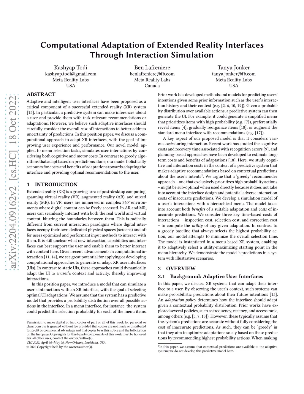 Adaptive and intelligent user interfaces have been proposed as a critical component of a successful extended reality (XR) system. In particular, a predictive system can make inferences about a user and provide them with task-relevant recommendations or adaptations. However, we believe such adaptive interfaces should carefully consider the overall \emph{cost} of interactions to better address uncertainty of predictions. In this position paper, we discuss a computational approach to adapt XR interfaces, with the goal of improving user experience and performance. Our novel model, applied to menu selection tasks, simulates user interactions by considering both cognitive and motor costs. In contrast to greedy algorithms that adapt based on predictions alone, our model holistically accounts for costs and benefits of adaptations towards adapting the interface and providing optimal recommendations to the user.