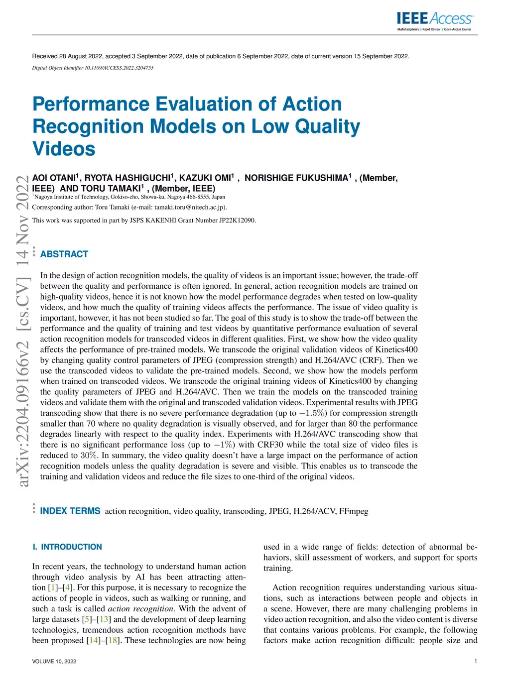 In the design of action recognition models, the quality of videos is an important issue; however, the trade-off between the quality and performance is often ignored. In general, action recognition models are trained on high-quality videos, hence it is not known how the model performance degrades when tested on low-quality videos, and how much the quality of training videos affects the performance. The issue of video quality is important, however, it has not been studied so far. The goal of this study is to show the trade-off between the performance and the quality of training and test videos by quantitative performance evaluation of several action recognition models for transcoded videos in different qualities. First, we show how the video quality affects the performance of pre-trained models. We transcode the original validation videos of Kinetics400 by changing quality control parameters of JPEG (compression strength) and H.264/AVC (CRF). Then we use the transcoded videos to validate the pre-trained models. Second, we show how the models perform when trained on transcoded videos. We transcode the original training videos of Kinetics400 by changing the quality parameters of JPEG and H.264/AVC. Then we train the models on the transcoded training videos and validate them with the original and transcoded validation videos. Experimental results with JPEG transcoding show that there is no severe performance degradation (up to -1.5%) for compression strength smaller than 70 where no quality degradation is visually observed, and for larger than 80 the performance degrades linearly with respect to the quality index. Experiments with H.264/AVC transcoding show that there is no significant performance loss (up to -1%) with CRF30 while the total size of video files is reduced to 30%.