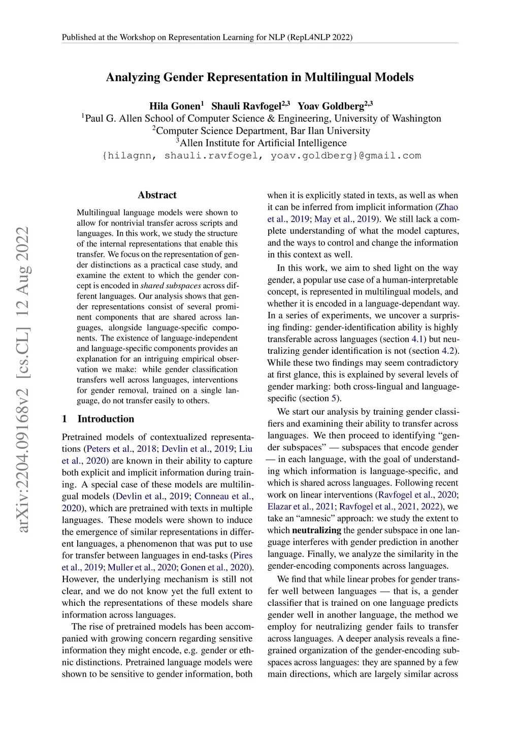 Analyzing Gender Representation in Multilingual Models