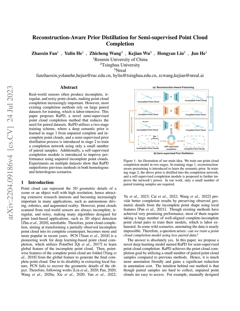 Real-world sensors often produce incomplete, irregular, and noisy point clouds, making point cloud completion increasingly important. However, most existing completion methods rely on large paired datasets for training, which is labor-intensive. This paper proposes RaPD, a novel semi-supervised point cloud completion method that reduces the need for paired datasets. RaPD utilizes a two-stage training scheme, where a deep semantic prior is learned in stage 1 from unpaired complete and incomplete point clouds, and a semi-supervised prior distillation process is introduced in stage 2 to train a completion network using only a small number of paired samples. Additionally, a self-supervised completion module is introduced to improve performance using unpaired incomplete point clouds. Experiments on multiple datasets show that RaPD outperforms previous methods in both homologous and heterologous scenarios.
