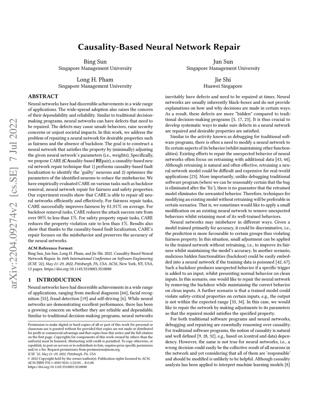 Neural networks have had discernible achievements in a wide range of applications. The wide-spread adoption also raises the concern of their dependability and reliability. Similar to traditional decision-making programs, neural networks can have defects that need to be repaired. The defects may cause unsafe behaviors, raise security concerns or unjust societal impacts. In this work, we address the problem of repairing a neural network for desirable properties such as fairness and the absence of backdoor. The goal is to construct a neural network that satisfies the property by (minimally) adjusting the given neural network's parameters (i.e., weights). Specifically, we propose CARE (\textbf{CA}usality-based \textbf{RE}pair), a causality-based neural network repair technique that 1) performs causality-based fault localization to identify the `guilty' neurons and 2) optimizes the parameters of the identified neurons to reduce the misbehavior. We have empirically evaluated CARE on various tasks such as backdoor removal, neural network repair for fairness and safety properties. Our experiment results show that CARE is able to repair all neural networks efficiently and effectively. For fairness repair tasks, CARE successfully improves fairness by on average. For backdoor removal tasks, CARE reduces the attack success rate from over to less than . For safety property repair tasks, CARE reduces the property violation rate to less than . Results also show that thanks to the causality-based fault localization, CARE's repair focuses on the misbehavior and preserves the accuracy of the neural networks.