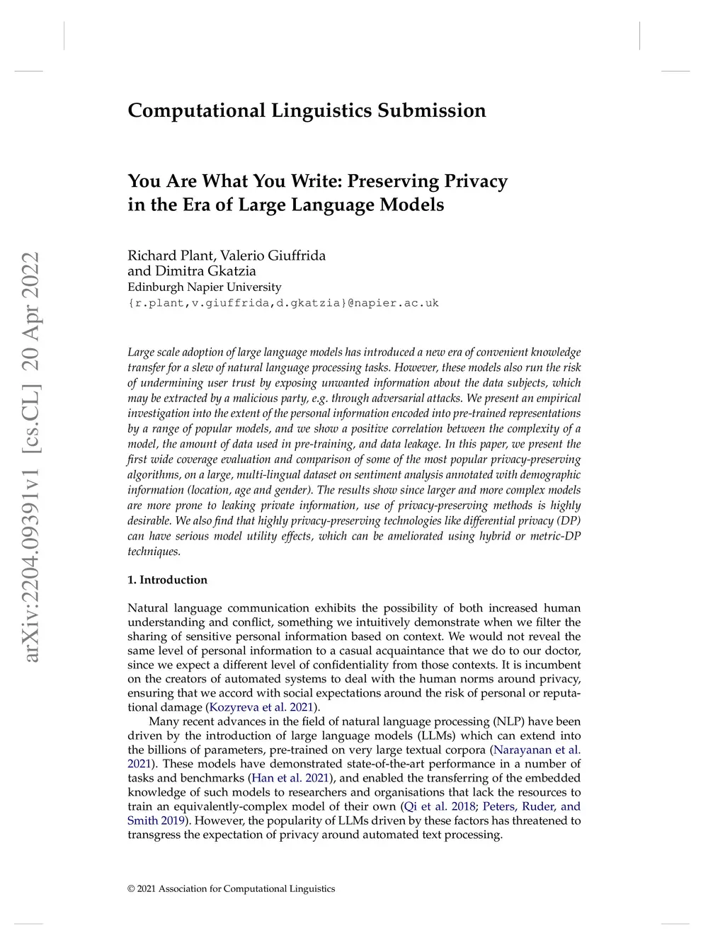 Large scale adoption of large language models has introduced a new era of convenient knowledge transfer for a slew of natural language processing tasks. However, these models also run the risk of undermining user trust by exposing unwanted information about the data subjects, which may be extracted by a malicious party, e.g. through adversarial attacks. We present an empirical investigation into the extent of the personal information encoded into pre-trained representations by a range of popular models, and we show a positive correlation between the complexity of a model, the amount of data used in pre-training, and data leakage. In this paper, we present the first wide coverage evaluation and comparison of some of the most popular privacy-preserving algorithms, on a large, multi-lingual dataset on sentiment analysis annotated with demographic information (location, age and gender). The results show since larger and more complex models are more prone to leaking private information, use of privacy-preserving methods is highly desirable. We also find that highly privacy-preserving technologies like differential privacy (DP) can have serious model utility effects, which can be ameliorated using hybrid or metric-DP techniques.