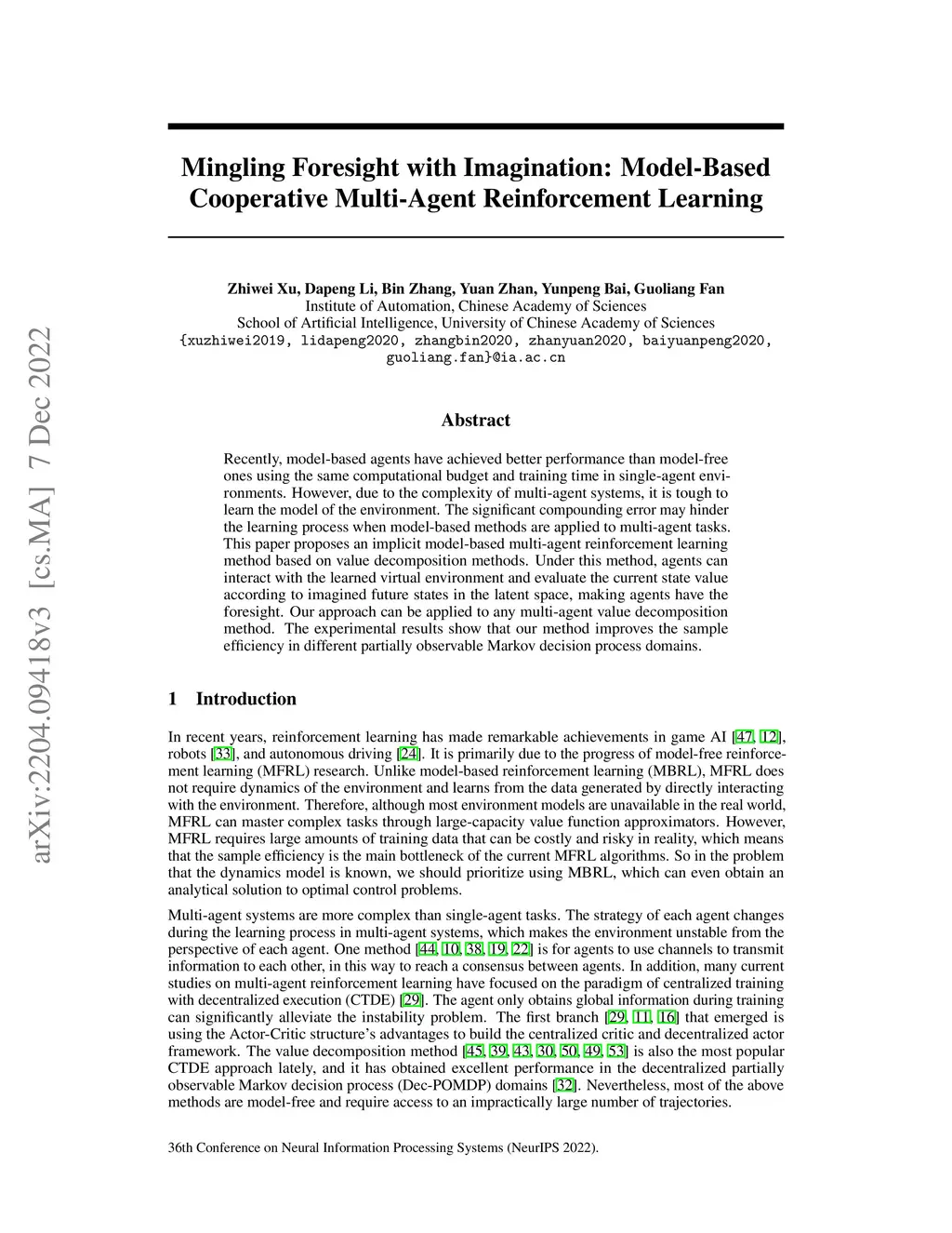 Recently, model-based agents have achieved better performance than model-free ones using the same computational budget and training time in single-agent environments. However, due to the complexity of multi-agent systems, it is tough to learn the model of the environment. The significant compounding error may hinder the learning process when model-based methods are applied to multi-agent tasks. This paper proposes an implicit model-based multi-agent reinforcement learning method based on value decomposition methods. Under this method, agents can interact with the learned virtual environment and evaluate the current state value according to imagined future states in the latent space, making agents have the foresight. Our approach can be applied to any multi-agent value decomposition method. The experimental results show that our method improves the sample efficiency in different partially observable Markov decision process domains.