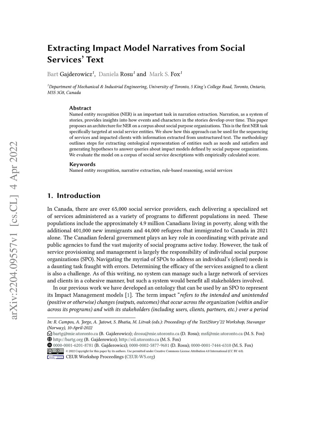 Named entity recognition (NER) is an important task in narration extraction. Narration, as a system of stories, provides insights into how events and characters in the stories develop over time. This paper proposes an architecture for NER on a corpus about social purpose organizations. This is the first NER task specifically targeted at social service entities. We show how this approach can be used for the sequencing of services and impacted clients with information extracted from unstructured text. The methodology outlines steps for extracting ontological representation of entities such as needs and satisfiers and generating hypotheses to answer queries about impact models defined by social purpose organizations. We evaluate the model on a corpus of social service descriptions with empirically calculated score.